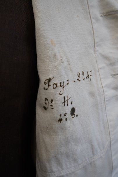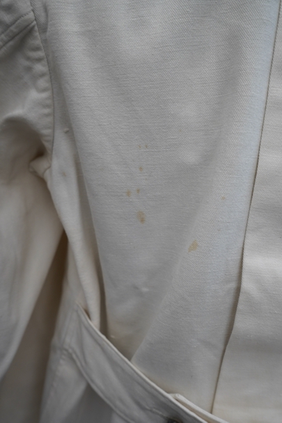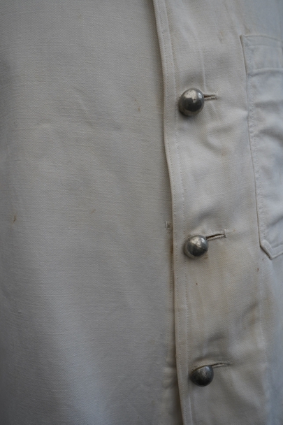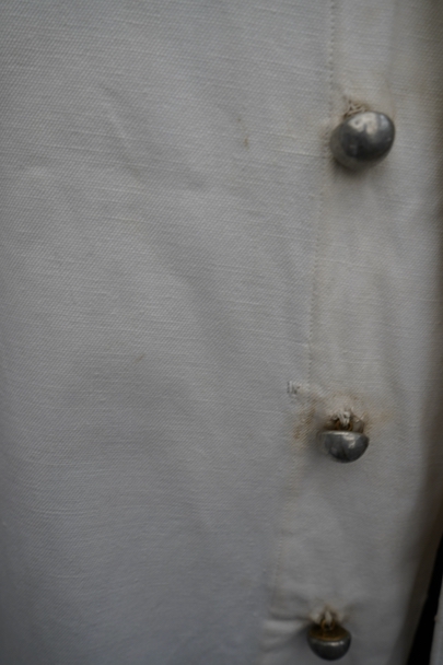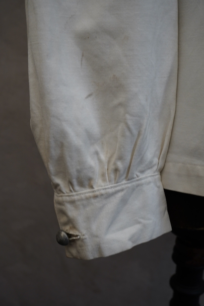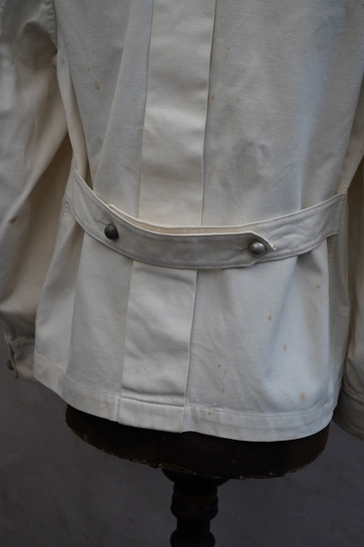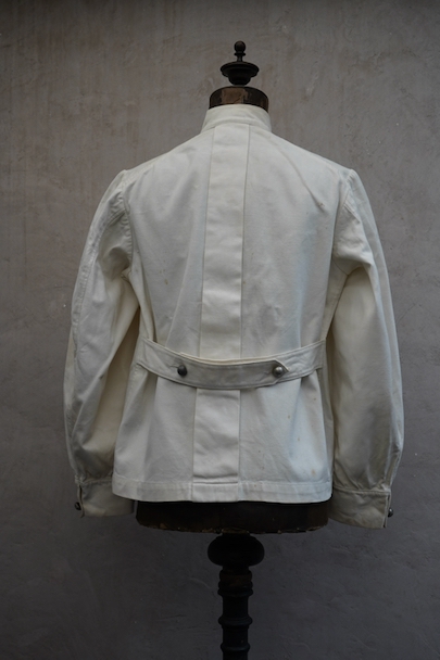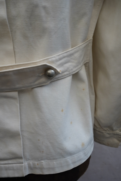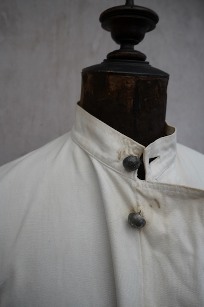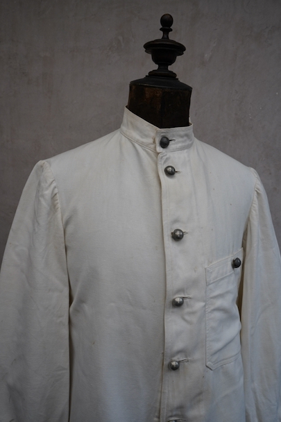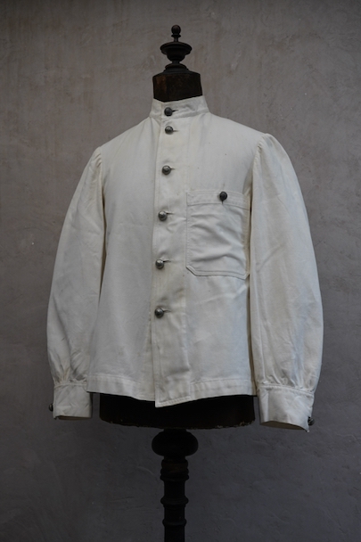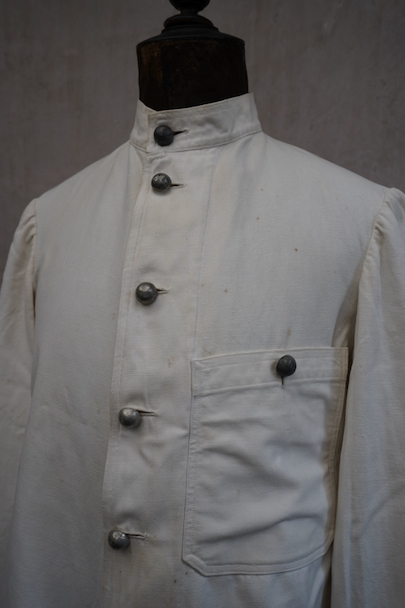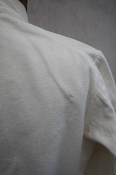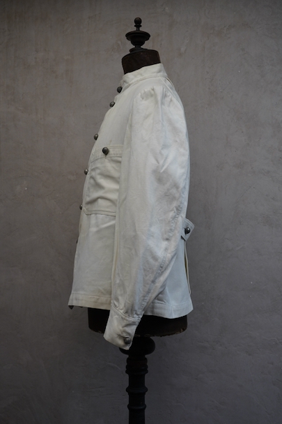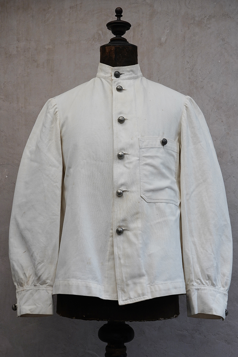 20世紀初期頃につくられたスタンドカラーの頃にある・ジャケット。内側にペン字でナンバーが書かれていますが、ミリタリーのスタンプなどはありません。短い丈の身頃に太めの袖、バックにマルタンガルがついています。左胸にボタン留めのパッチ・ポケット。コロンとした風合いの良いメタルボタン、ボタンホールは手縫いです。全体的に細かいシミや黄ばみがあります。その他は目立ったダメージはなく、状態は良いです。