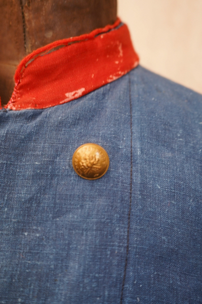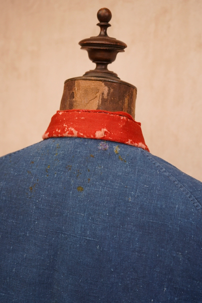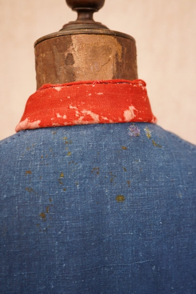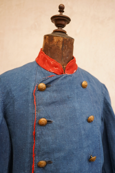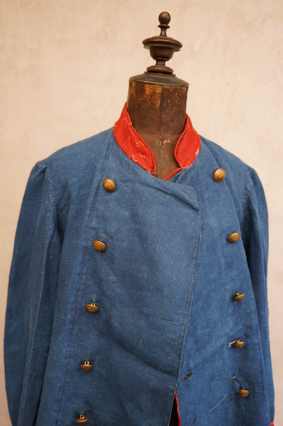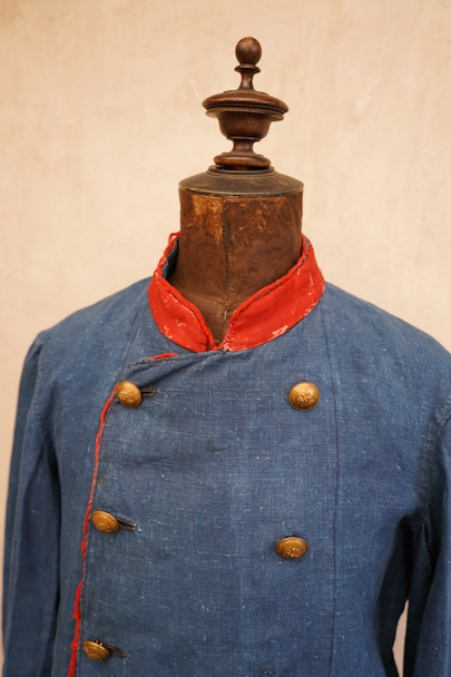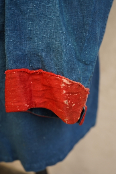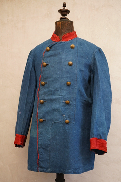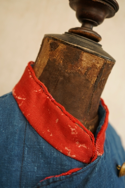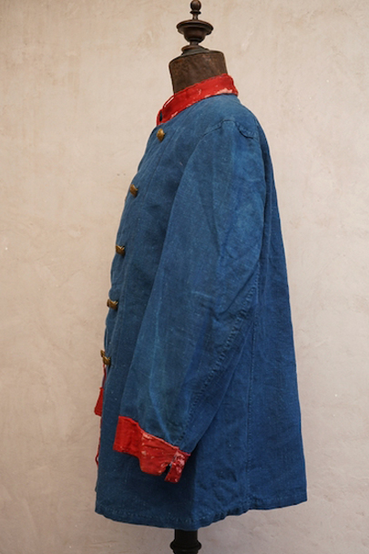 ダブルブレストのインディゴ・リネン素材のファイヤーマン・ジャケット。19世紀頃につくられたものだと思います。襟や前立て、カフ部分に赤く飾られていますが、ほつれや裂けなどの劣化が見られます。多少の色むら、シミや小さい穴、直し痕があります。全体的な状態は良いです。袖が短めです。