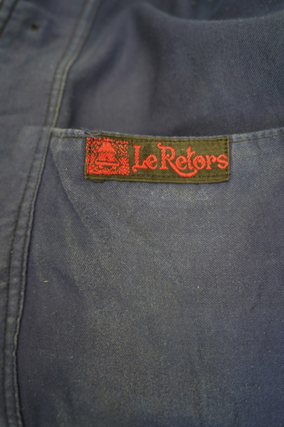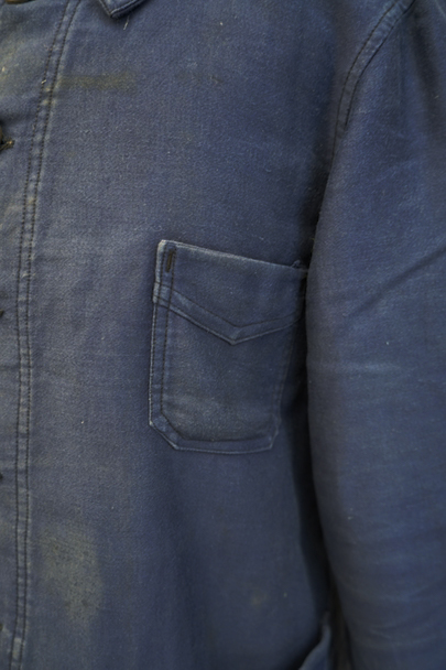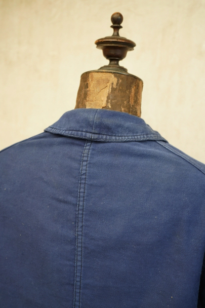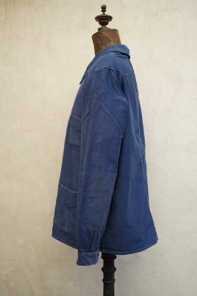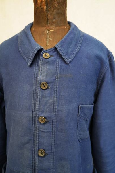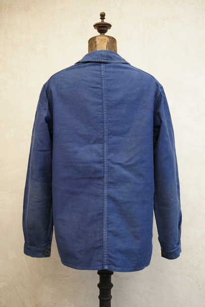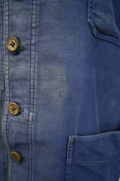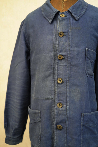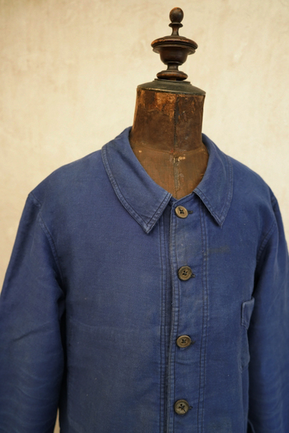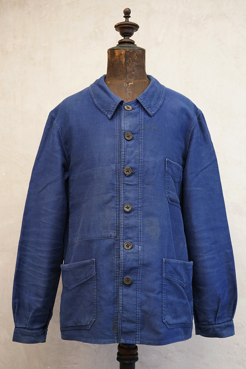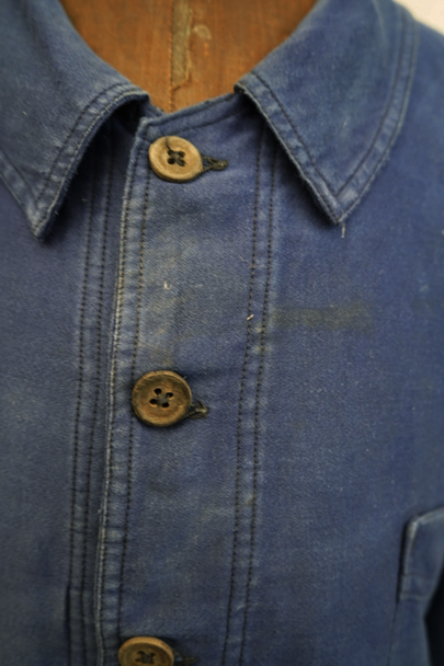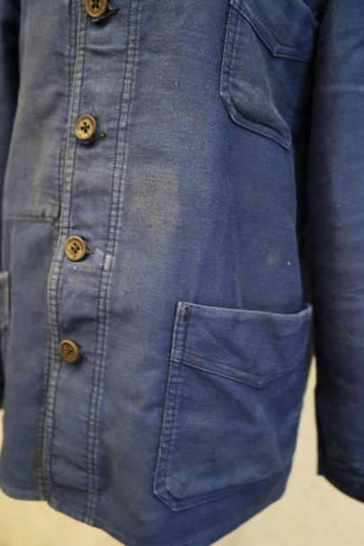 1930年代頃につくられたブルー・モールスキン・ワークジャケット。比較的薄手のモールスキン、数少ない6ボタン留めです。ウッド・ボタン、フレンチワークらしい丸くカーブした襟、Vヘムのポケット、申し分のないディテールです。全体的に薄いシミが見られます。多少の傷はありますが、穴などの大きなダメージはなく状態は良好です。"Le Retors"刺繍タグがついています。