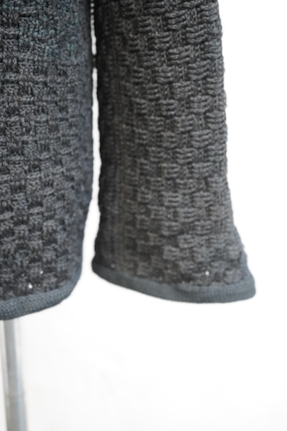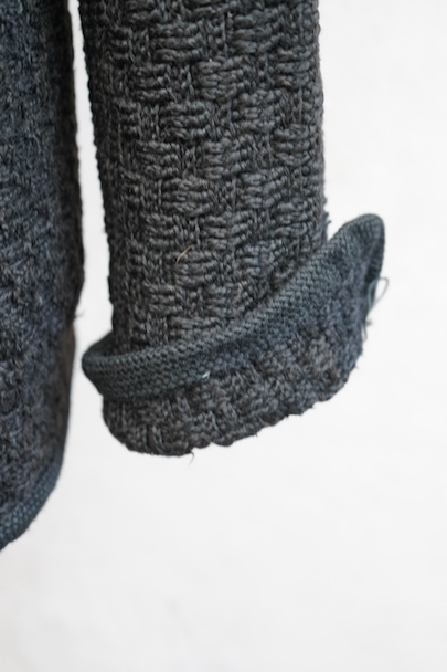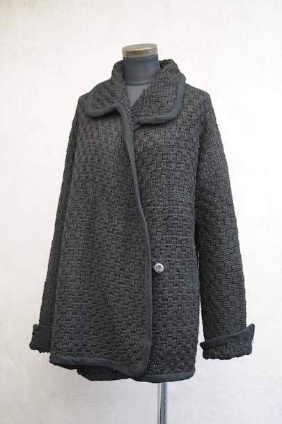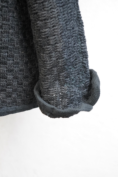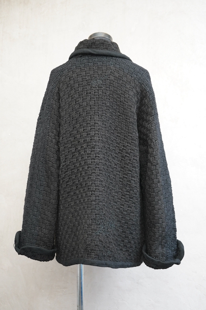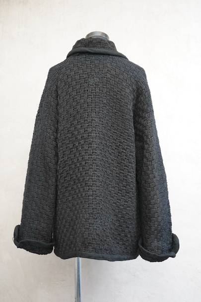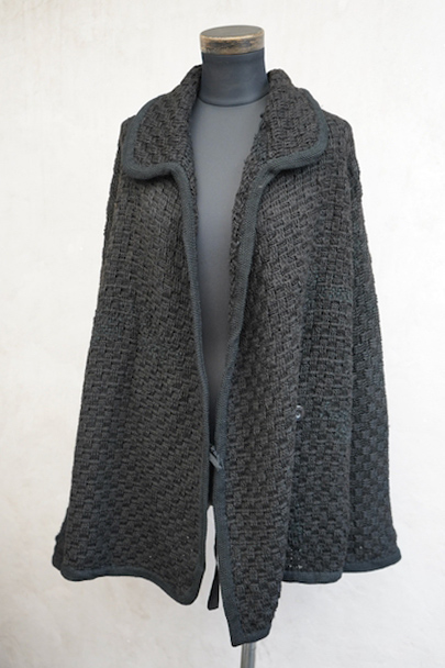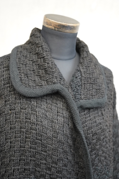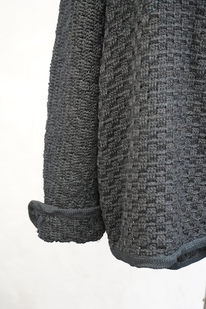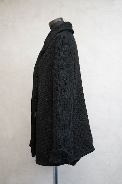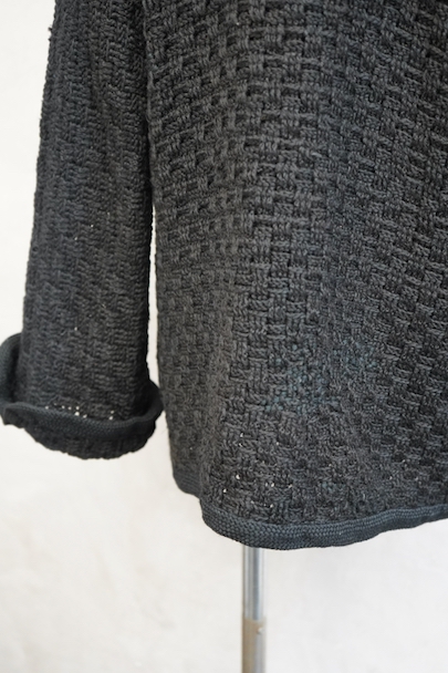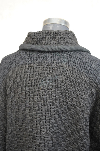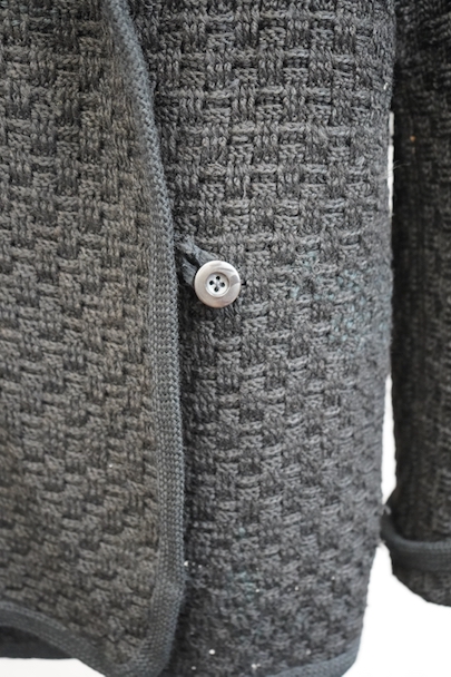 1930年代頃につくられたニット。若干コットンが混ざったようなウール地です。珍しいラップタイプで、ボタンはコロゾナット。パイピングも良い風合いです。全体的に直し痕、擦れ、穴など使用感があります。ダメージを気にされない方にお勧めです。袖口を折り返した状態での裄丈は82cmくらいです。