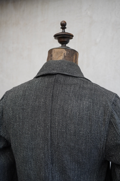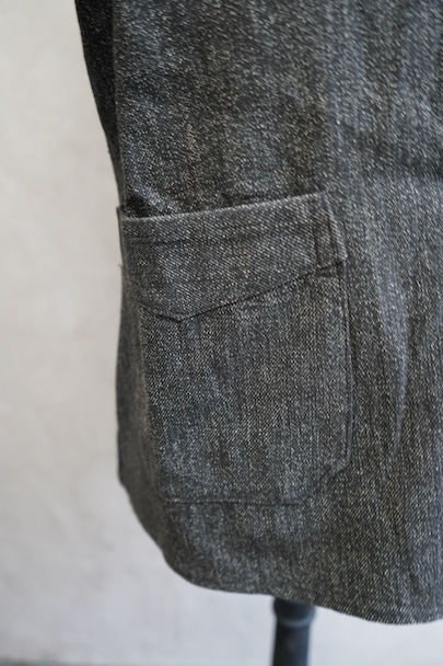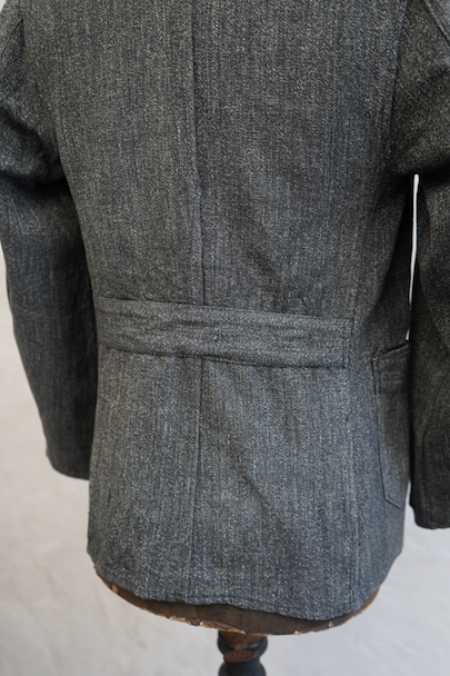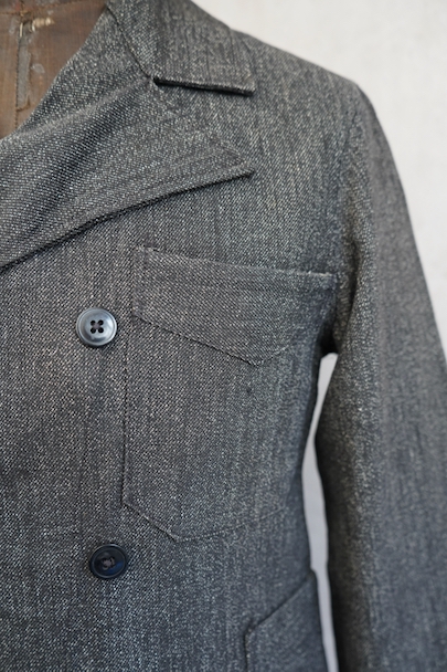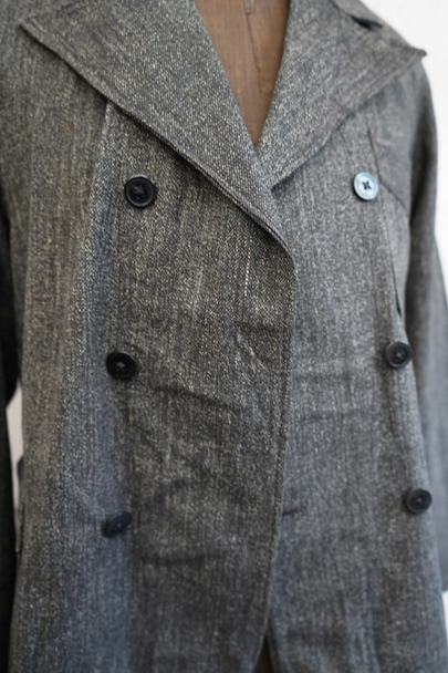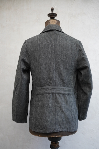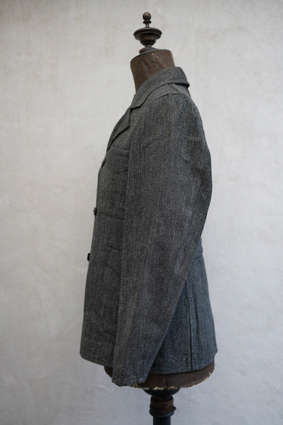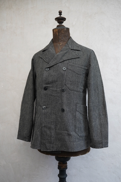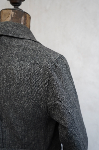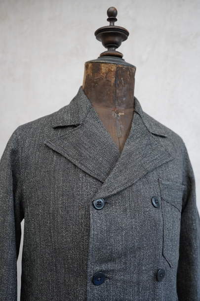 ごま塩コットン素材のワークジャケット。広いラペルのダブルブレスト。Vポケット、バックにはマルタンガル。使用感はなく状態はとても良いです。ボーイズ・サイズ、女性にお勧めです。フランス仕入れですが、ベルギーなど近隣国のもののように思います。