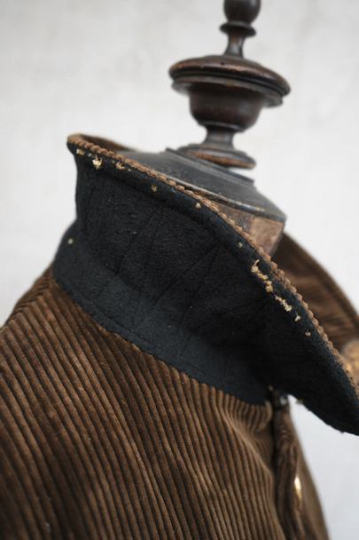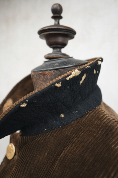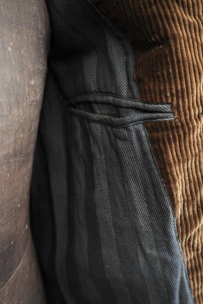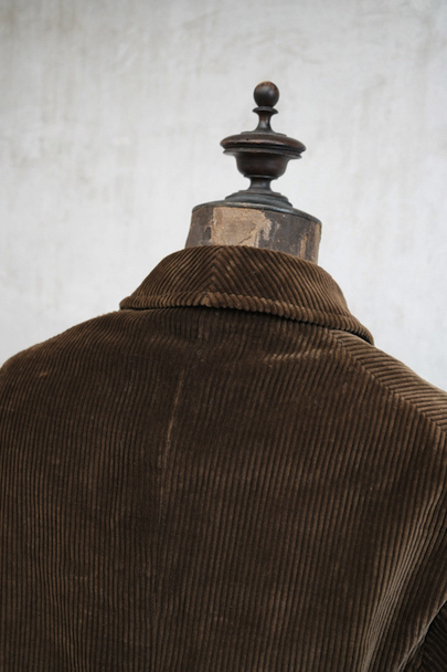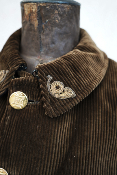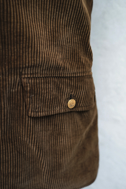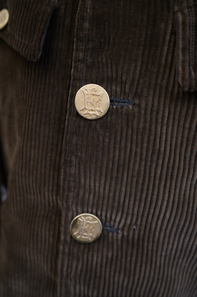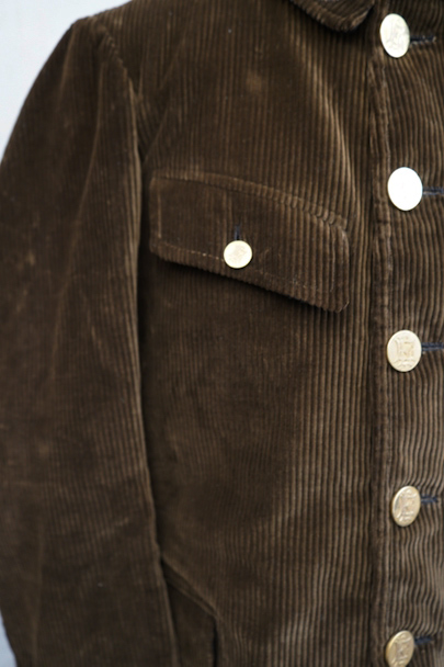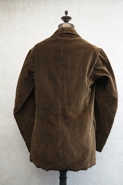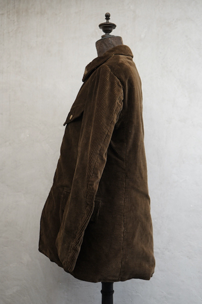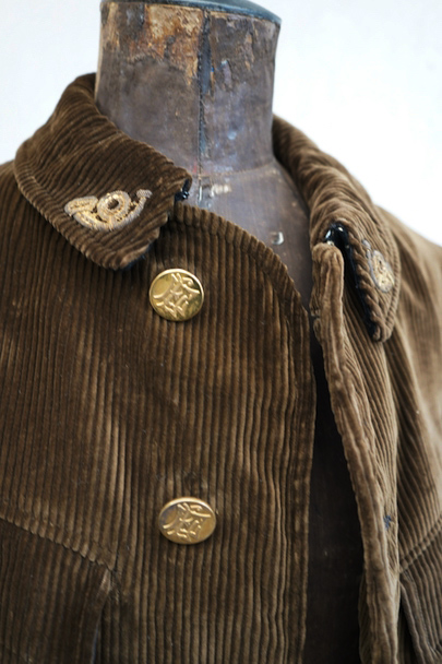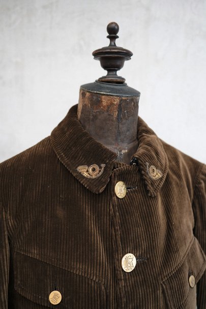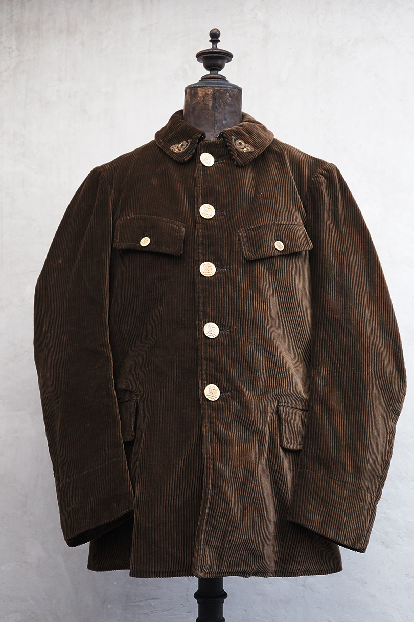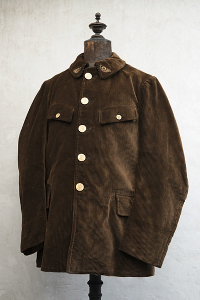 1930年代頃までにつくられたハンティングのゲームキーパー用ジャケット。ブラウンのコーデュロイ素材、デッドストックを一度洗濯しています。襟にメタル糸で作られたハンティング・ホーンがモチーフの襟章が付き、ELとイニシャルが入ったメタル・ボタンが揃えられています。フロントに4つのボタン留めフラップ・ポケット、長めの着丈で立体的な作りのシルエットが綺麗な品です。内ポケットは左右にあります。裏地はストライプ柄。襟裏のウール地に虫喰いの穴が多くあります。それ以外はダメージがない良いコンディションです。
