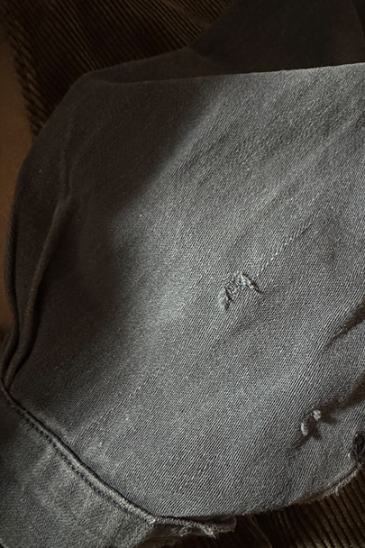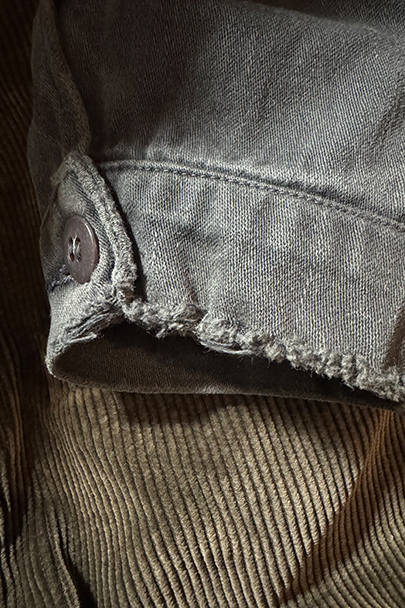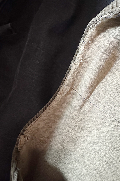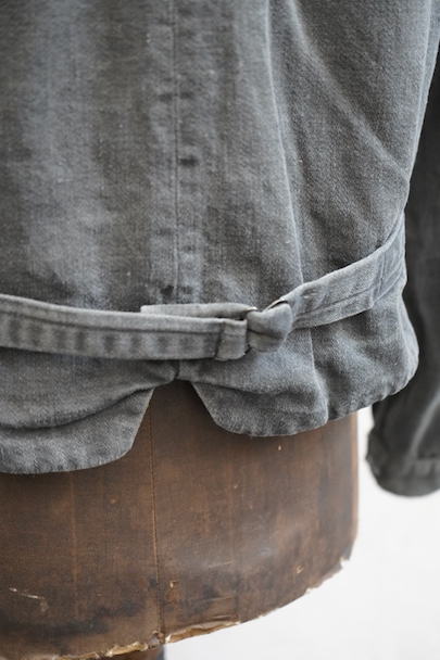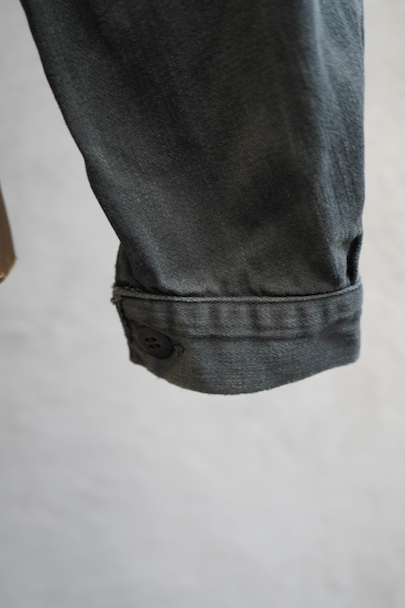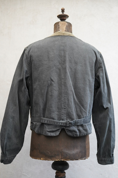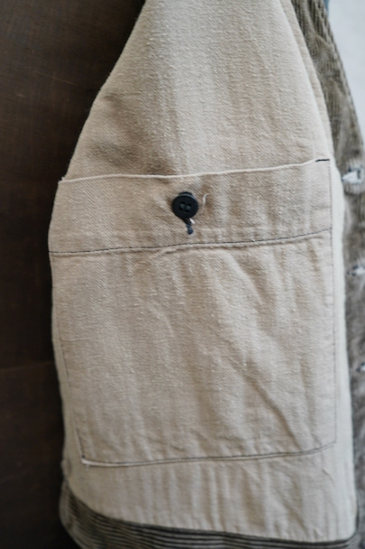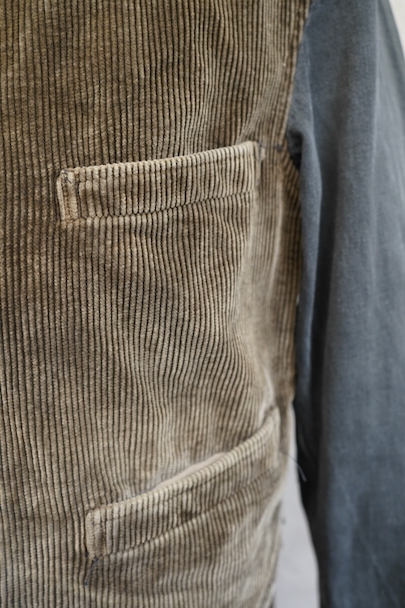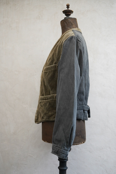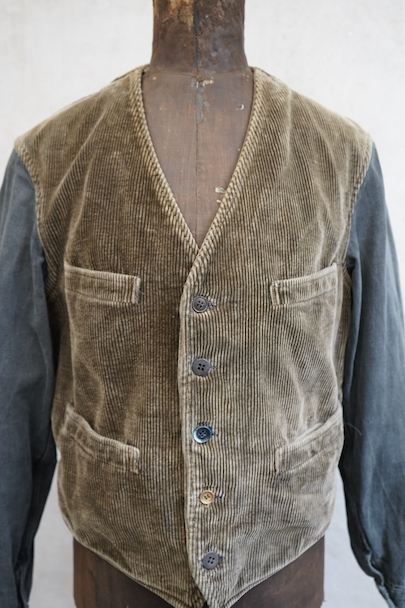 1940年代頃までにつくられた袖付きコーデュロイ・ジレ。この手のものは小さいサイズのものが多いですが、こちらは比較的ゆとりのある良いサイズです。前身頃はブラウンの太畝コーデュロイ、袖と後身頃は比較的厚みのある風合いの良いブラック・コットン・ツイル素材です。フロントに4つのポケット、内ポケットが1つ。バックシンチで身幅の調節ができます。袖口に擦り切れ、袖口近くに小穴、首周りの内側に擦れた穴、ボタンは様々なものにつけ替わっています。ダメージは着用に問題無く、色褪せ具合も良い味わいがでています。