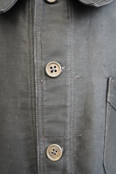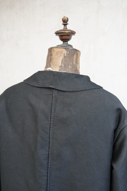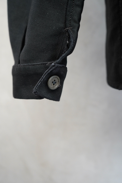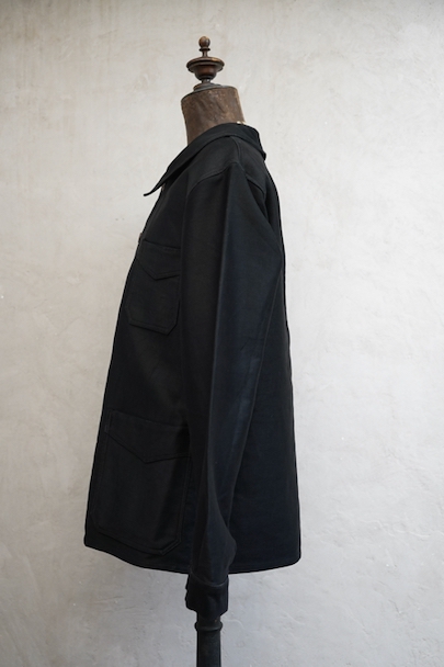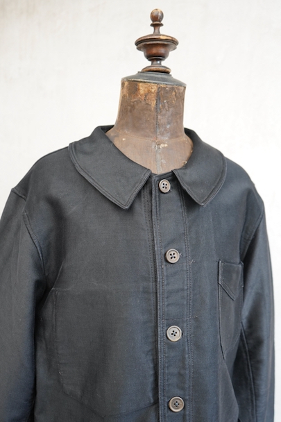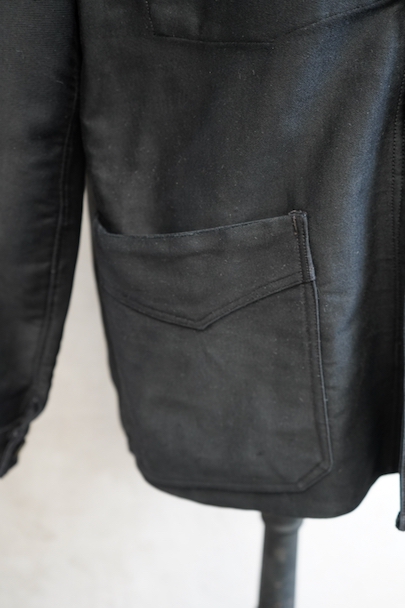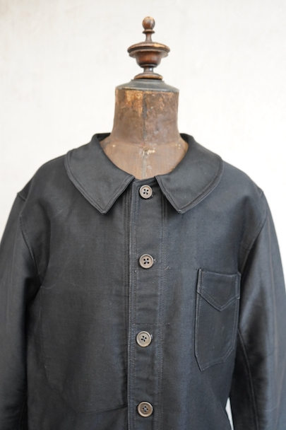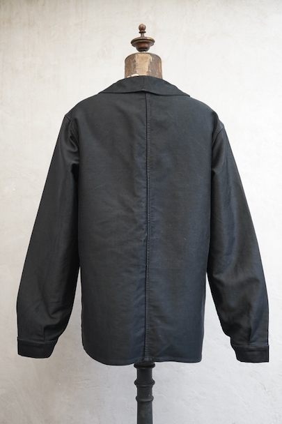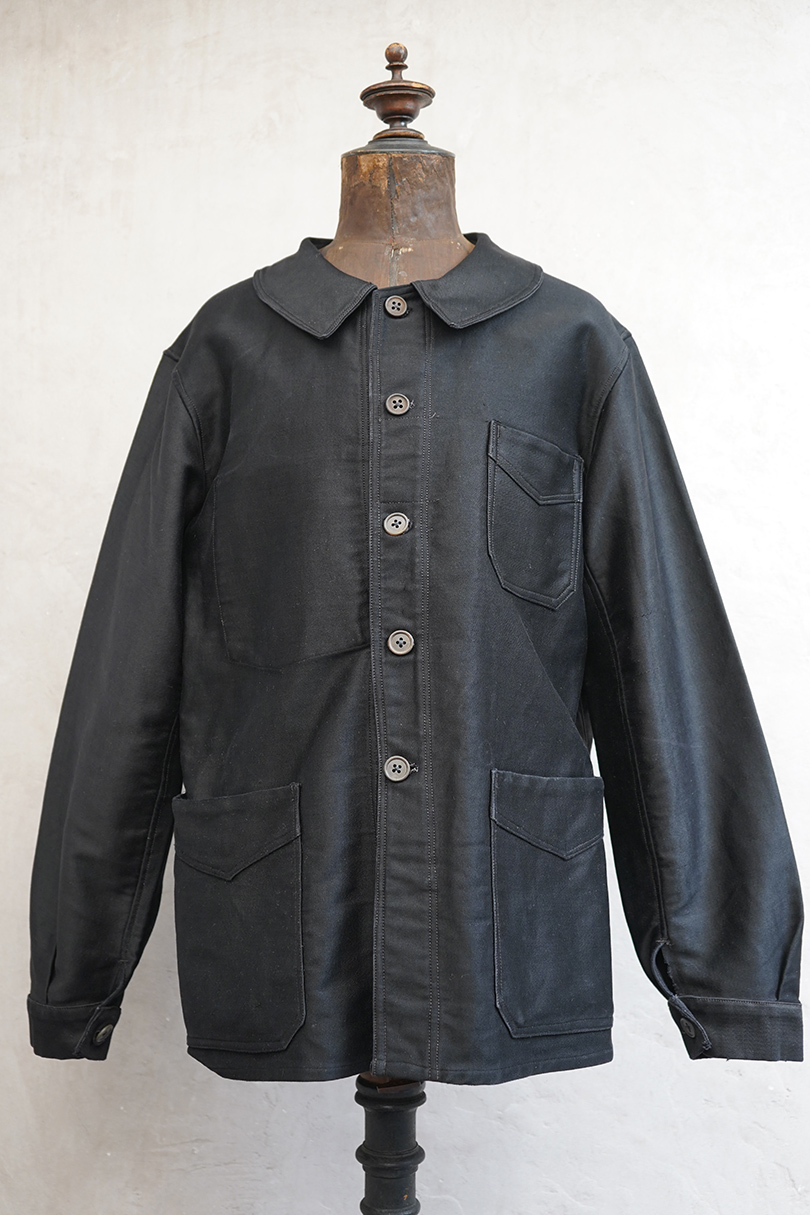 1940年代頃までにつくられたブラック・モールスキン・ワークジャケット。 "Le St Pierre"のもので、通常のものよりももっちりとした肌触りの良いモールスキンが使われ、光沢がある風合いが良い一着です。フレンチワークらしい丸くカーブした襟、Vポケット、フロントのボタンはウッド製です。袖口のボタンはつけ替わっているようです。襟の内側に擦れた傷み、その他多少の擦れなどはありますが、全体的に大きなダメージはなく状態は良好です。