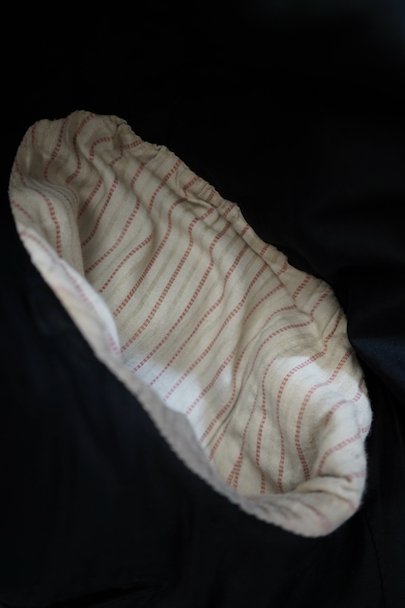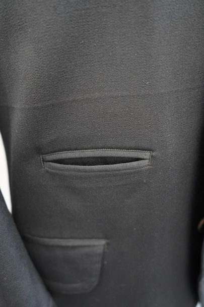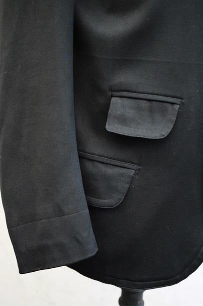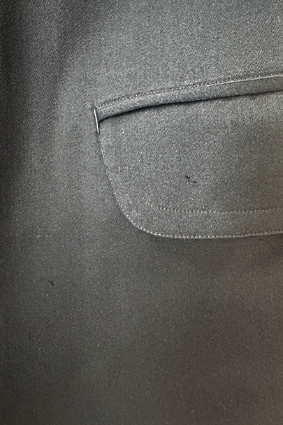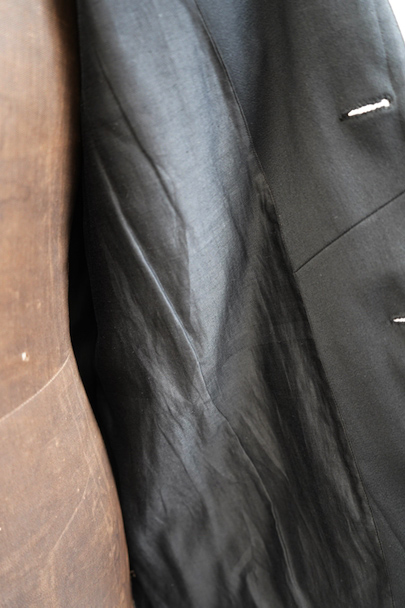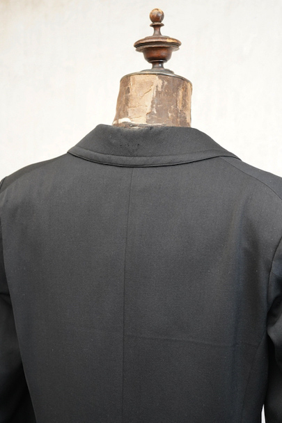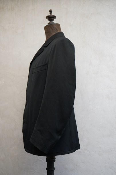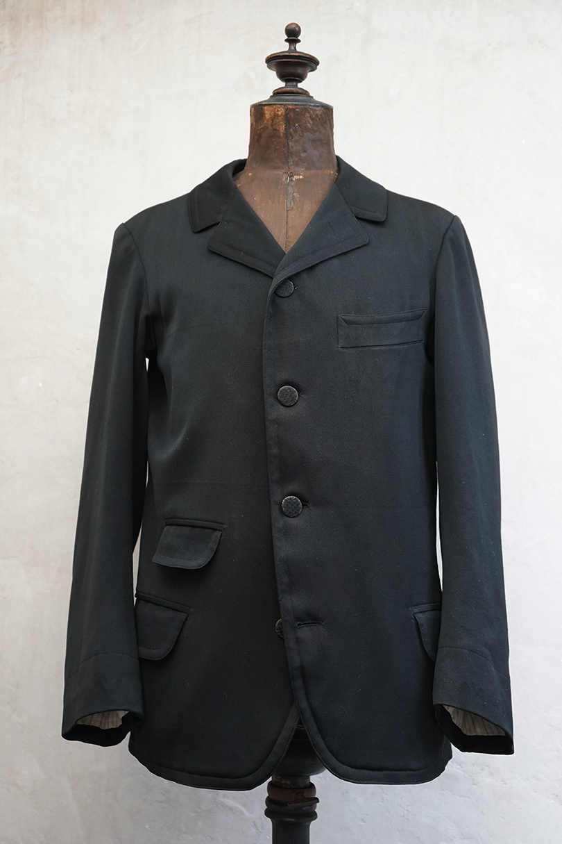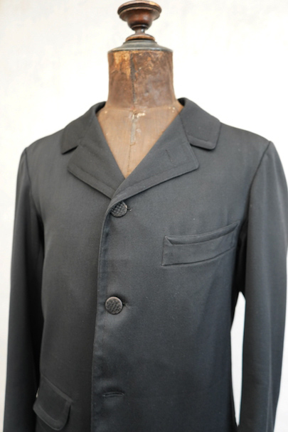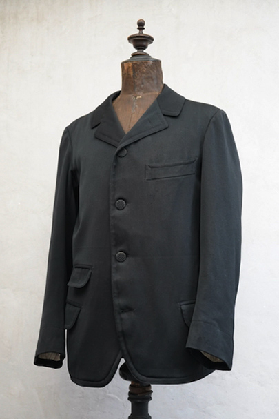 20世紀初期頃につくられたサックコート。フロント4つボタン留めで詰まった襟元、チェンジポケットつき。ボタンは包みボタンです。こちらは肩にパッドが入っています。襟内側に擦れた傷み、全体的に小さい穴、擦れがある等の使用感があります。