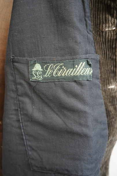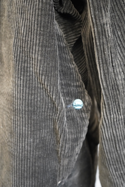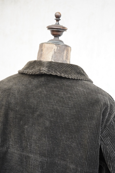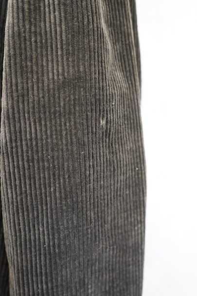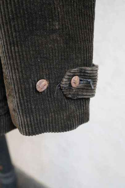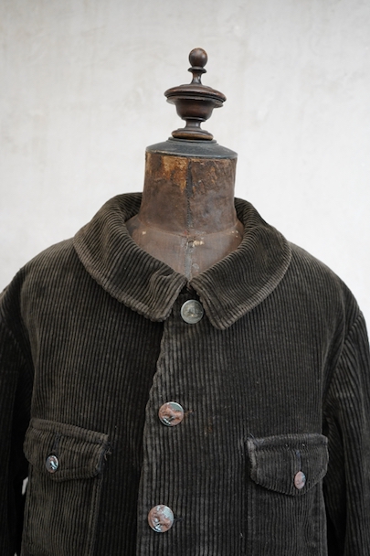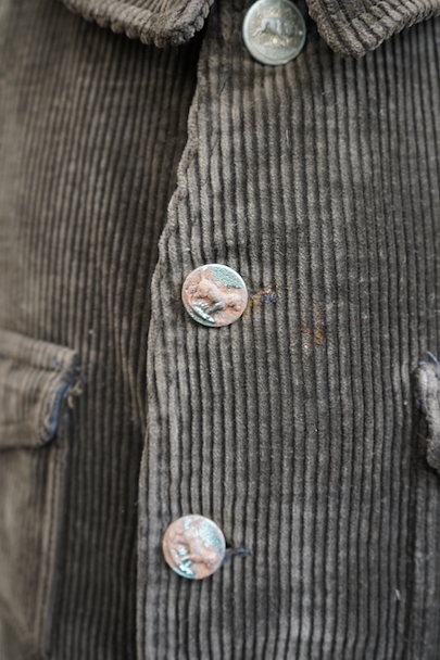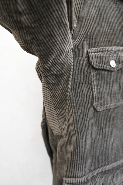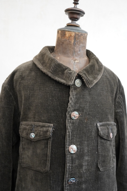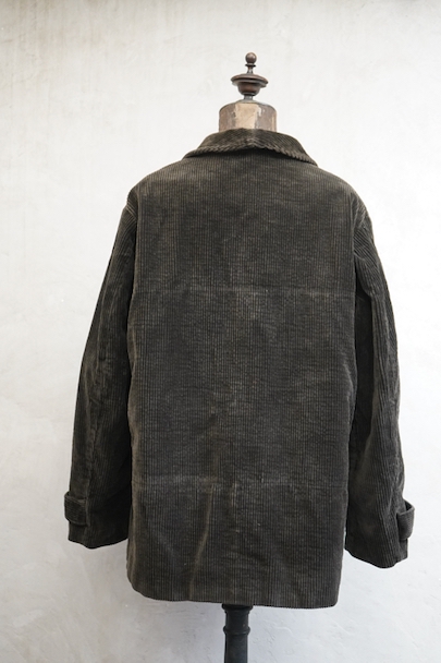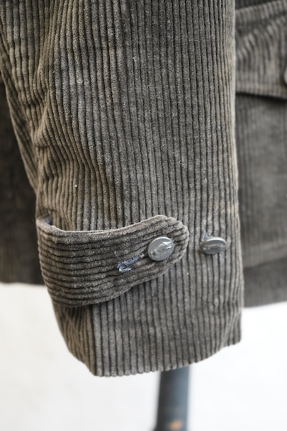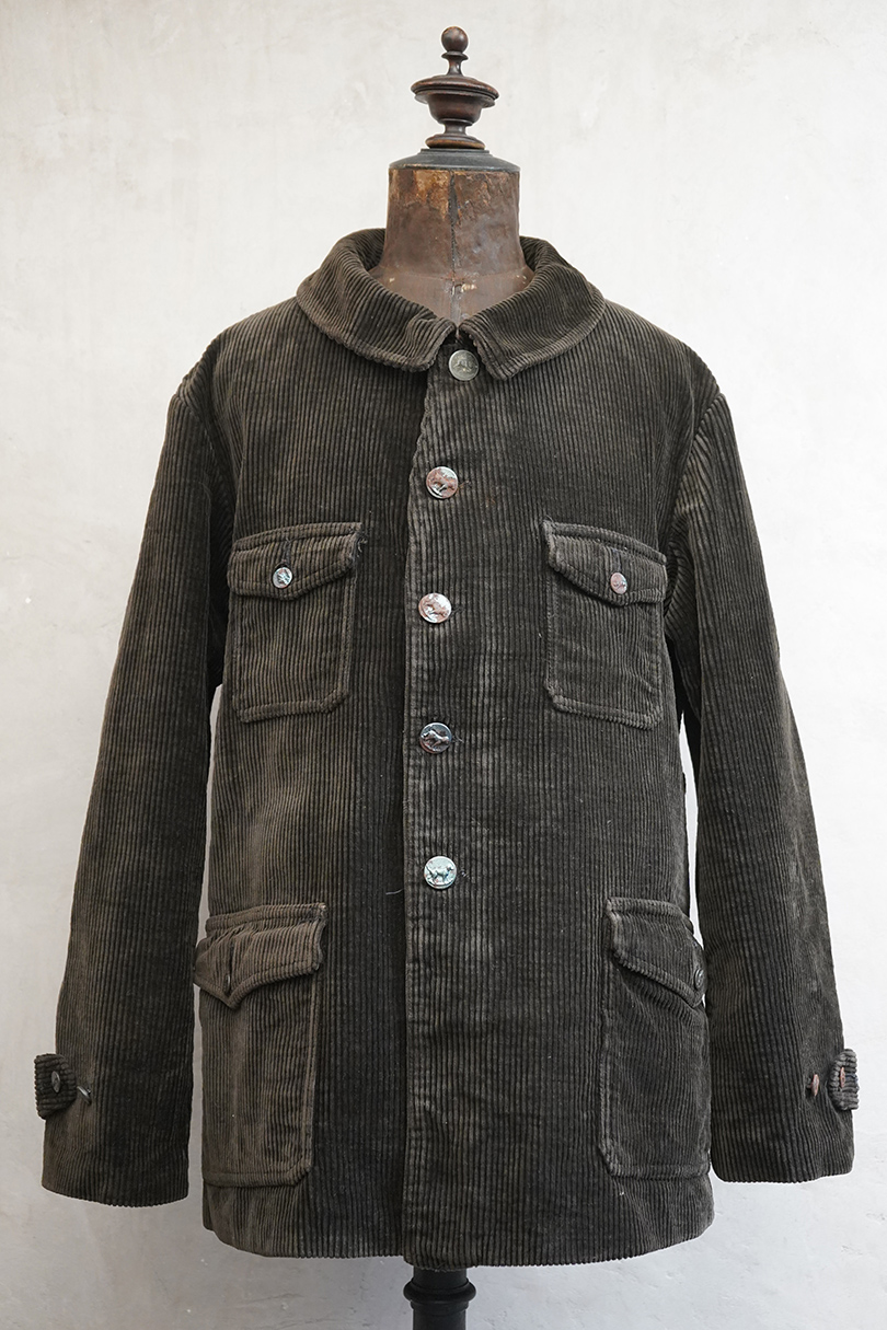 1940年代頃につくられたダーク・ブラウンのコーデュロイ・ハンティング・ジャケット。丸くラウンドした襟が特徴的、フロントに4つのボタン留めフラップ・ポケット、バックに配されたハンティング特有の大きなゲームポケットや動物柄のメタルボタン、動きを考えられたピボット・スリーブ、袖口にはタブ。ボタンにサビがあり、所々にサビ染みが見られます。使用感はありません。