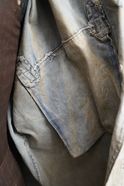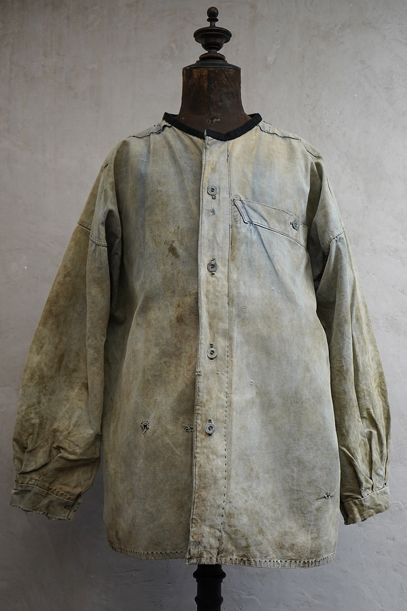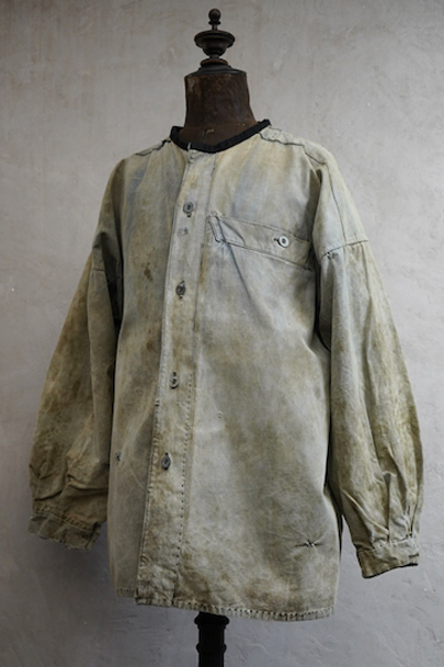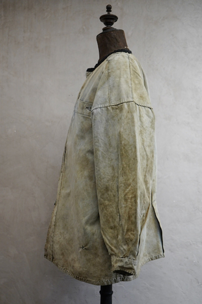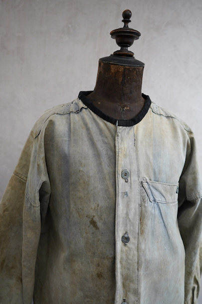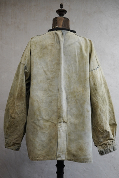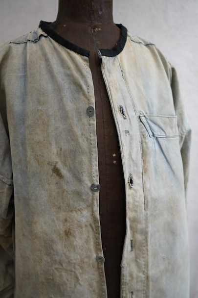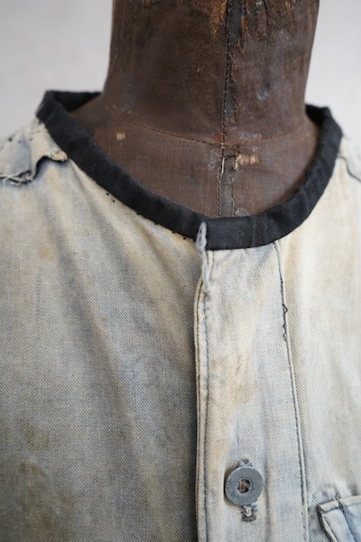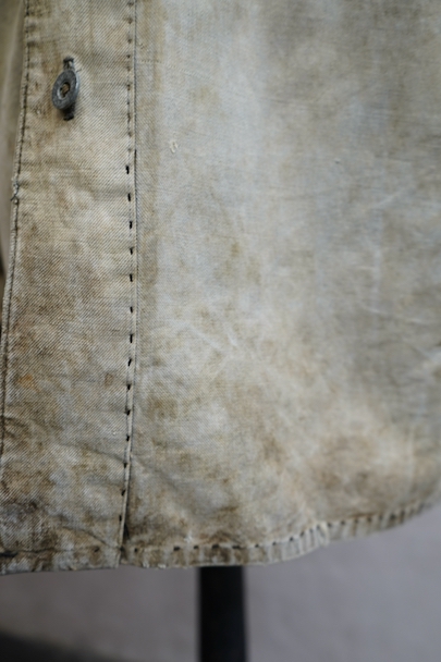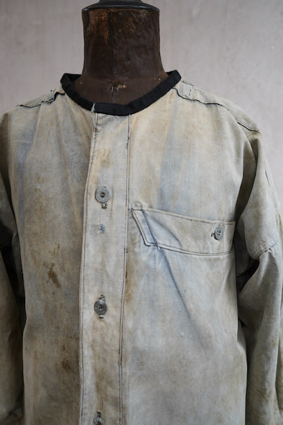 フランス軍の作業用ジャケット。1930年代以前のものだと思います。元々はブルーだったコットンの布地、かなり使い込まれて退色し、長年の汚れで現在の姿になっています。元々立ち襟がついていたと思いますが、取られて黒い別布でパイピング処理されています。左胸に大きなボタン留めポケット。バック・ベルトも外されています。全体的に縫い直した跡があり、ほつれや擦れ、穴、シミ、直し痕が多くあります。