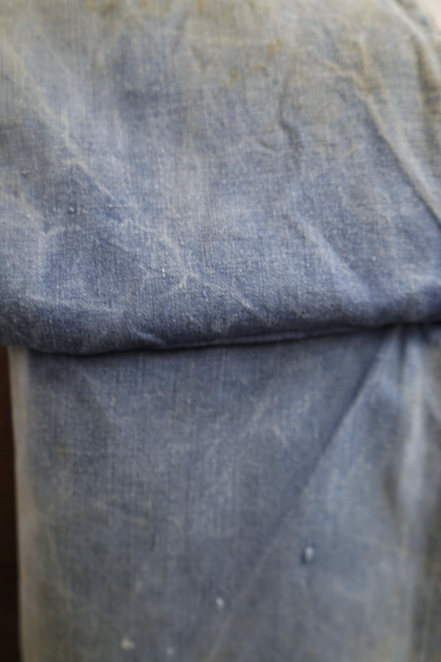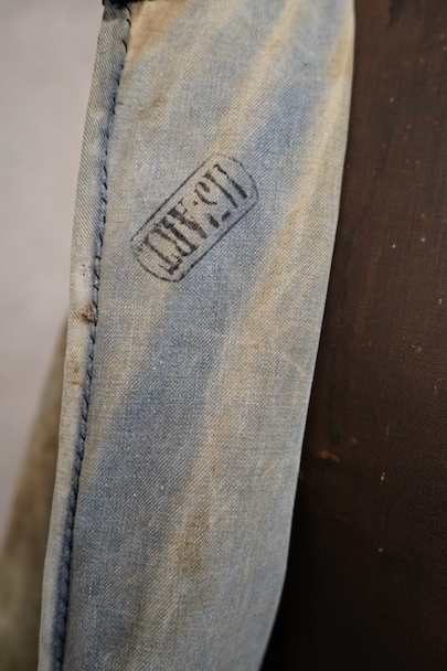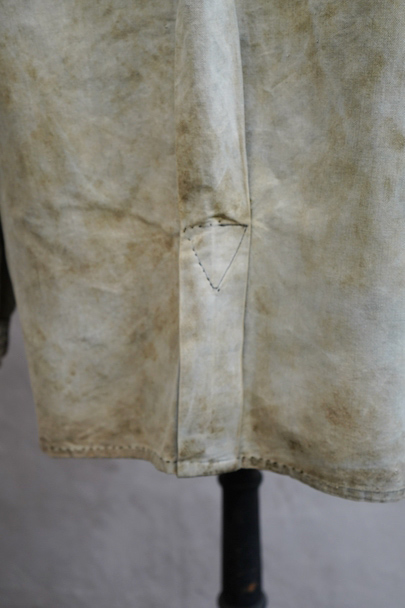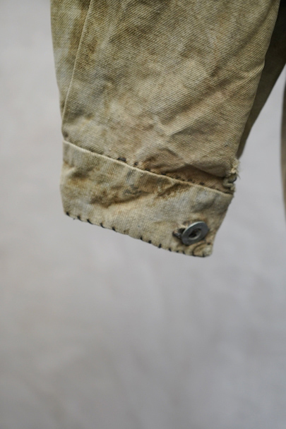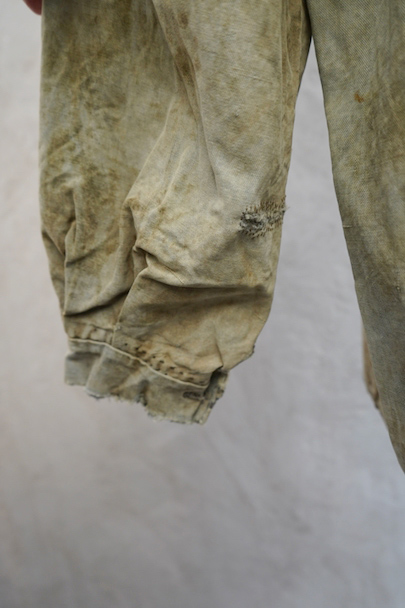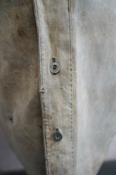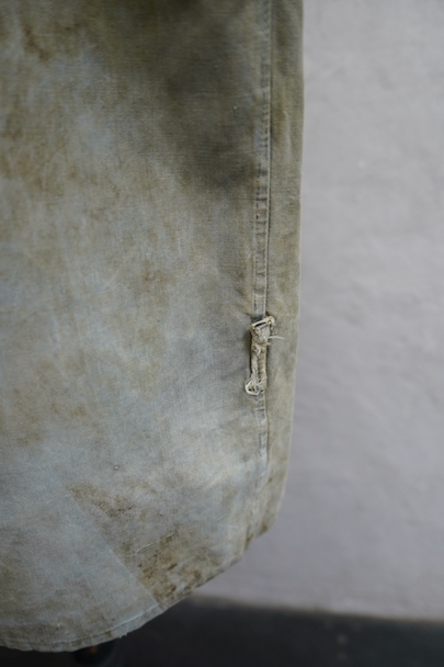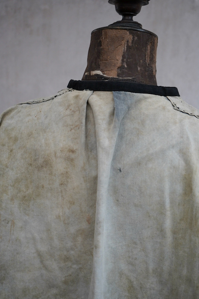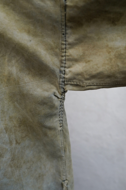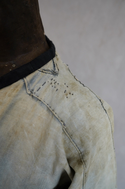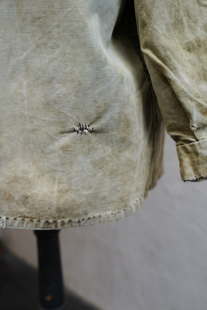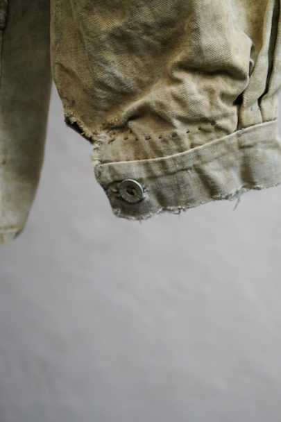 フランス軍の作業用ジャケット。1930年代以前のものだと思います。元々はブルーだったコットンの布地、かなり使い込まれて退色し、長年の汚れで現在の姿になっています。元々立ち襟がついていたと思いますが、取られて黒い別布でパイピング処理されています。左胸に大きなボタン留めポケット。バック・ベルトも外されています。全体的に縫い直した跡があり、ほつれや擦れ、穴、シミ、直し痕が多くあります。
