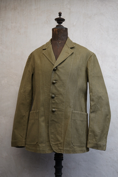 1940年代頃につくられたフランス軍のジャケット。退役し民間に戻る際に支給されたものです。オリーブ・カラーのコットン素材、フロント4つボタン留め、少し裾がラウンドした綺麗な形です。コロンとしたメタル・ボタンがついています。未使用品を一度洗濯しています。多少のアタリはありますが、状態はとても良いです。
