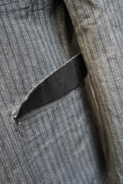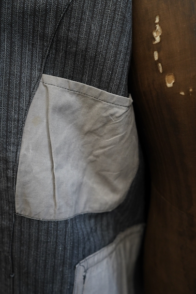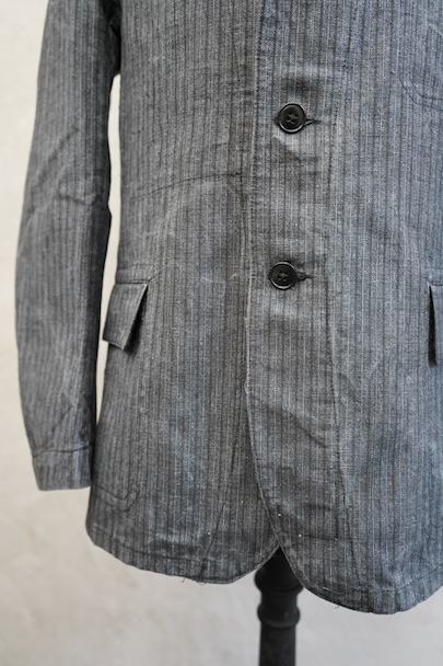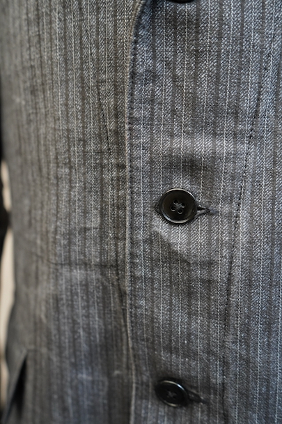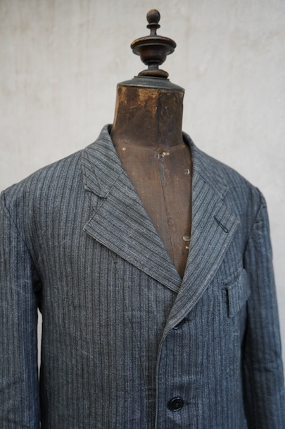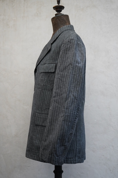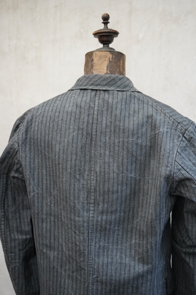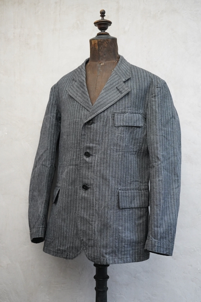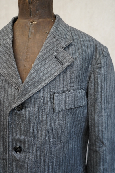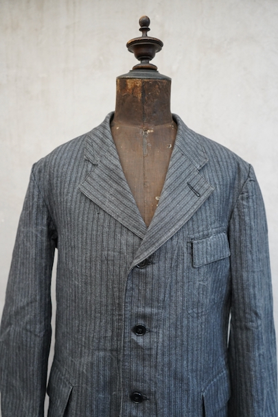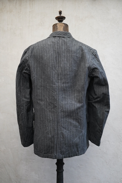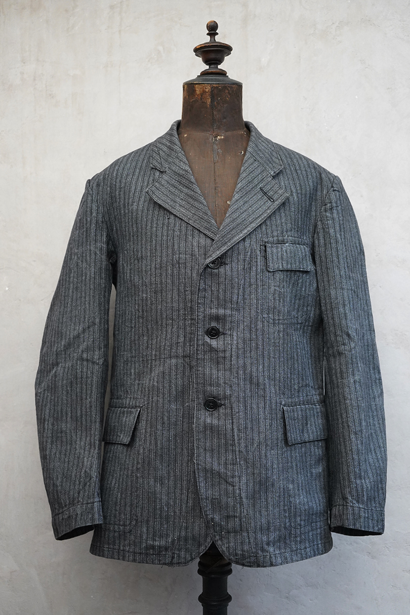 1940年代頃までにつくられたストライプ織り柄のごま塩コットンのワーク・ジャケット。未使用品を一度洗濯しています。ラペルド・タイプ、フロント3つボタン留め、ボタンはパピエマシェです。、3つのフラップ・ポケット、内ポケットも1つついています。多少のアタリがありますが、大きなダメージはなく状態は良いです。