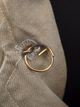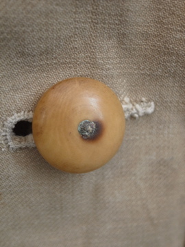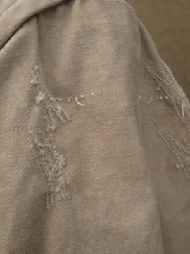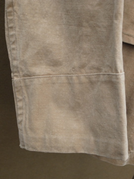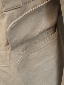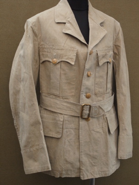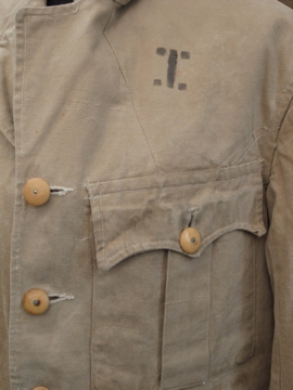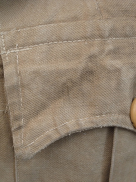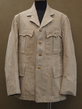 1940年代頃につくられたミリタリー ・ジャケット。ハリがありますが、しっとりとした良い質感のコットン素材です。胸元のフラップポケットやバックに縫い付けられたウエストベルト、立体的な袖など、ディテールに凝ったつくりです。ボタンはチェンジボタンが使用されています。左右の肩と袖口に直し痕があり、スレ、色ムラ、糸のほつれ、小さな穴など全体的に経年の傷みがあります。多少の傷みはありますが、褪せた色目や素材感の良さでとても良い雰囲気のある品です。