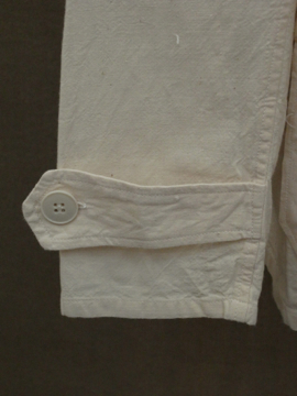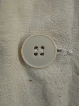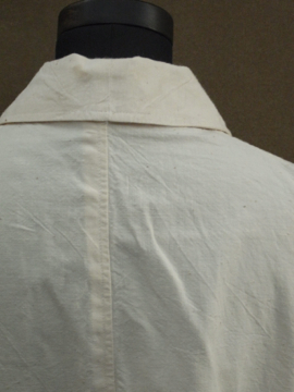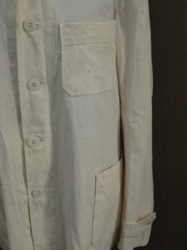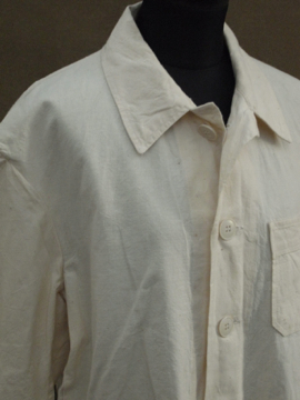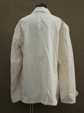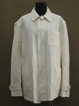 20世紀中期頃につくられたコットン・ジャケット。生成りの比較的薄手の素材です。立体的な袖のつくり、袖口にタブ、ポケットはフロントに計3つ。未使用品を一度洗濯しています。保管中にできた薄い黄ばみや汚れ等、経年の傷みが少しありますが状態は良いと思います。