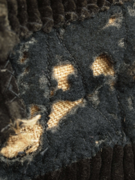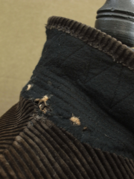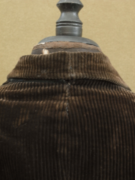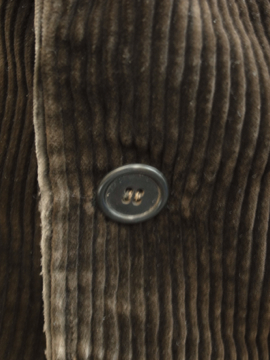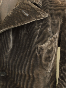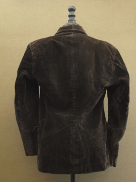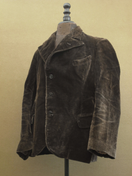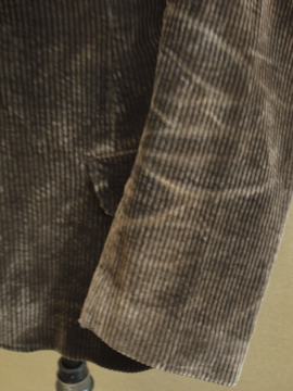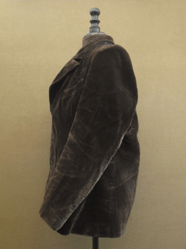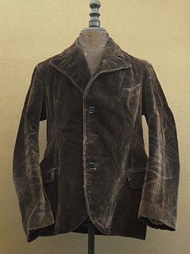 1930年代頃につくられたワーク・ジャケット。Aラインの良いシルエットです。太畝のコットン・コーデュロイ地は肉厚でとても良い風合いです。ピークドラペルの大きな襟、斜めに付いた胸ポケットや肩パッド、襟裏のステッチやジュートの芯地など細部も良いです。襟裏と袖口に穴、そのほか擦れや直し痕など全体的に多少の傷みがあります。年代を考えると状態は良い方だと思いますが、ダメージを気にされない方にお勧めです。