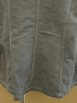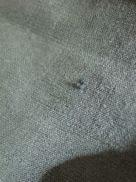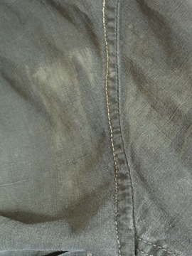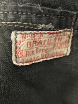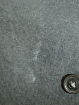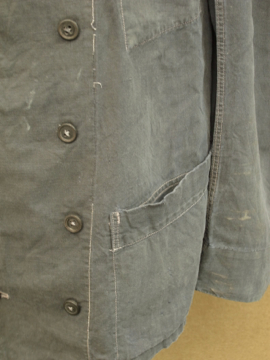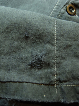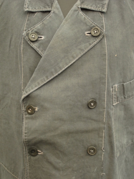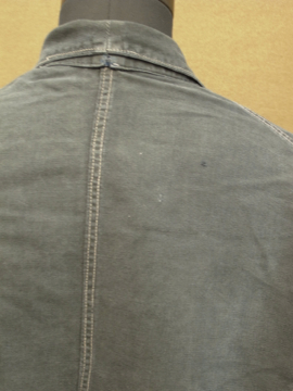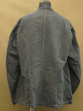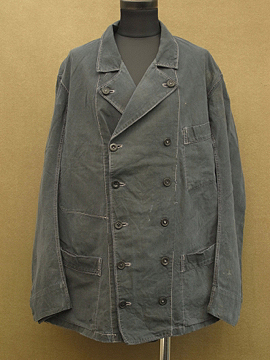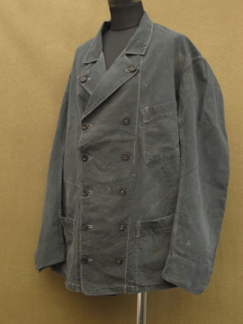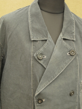 1930年代頃につくられたブラック・リネンコットンのダブル・ワークジャケット。薄手の良い生地感で黒が良い具合にフェードした色に白いステッチが映えます。シルエットが美しく、ボタン留めの襟、斜めについたポケット等、ディテールもとても良い品です。ボタンは黒塗りのホーンボタン、2つ付け替わっていますが他はオリジナルで残っています。前身頃中央あたりと左肩、袖等に薄く白いシミがあります。裾近くと右肘、左脇に丁寧な直し痕、全体的にほつれ、色むらやスレ、小さな穴等の経年の傷みがあります。