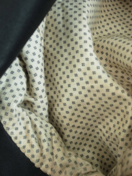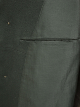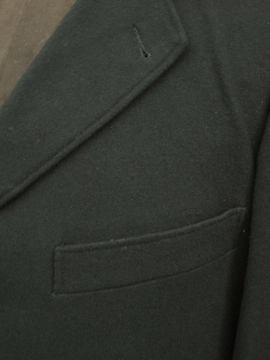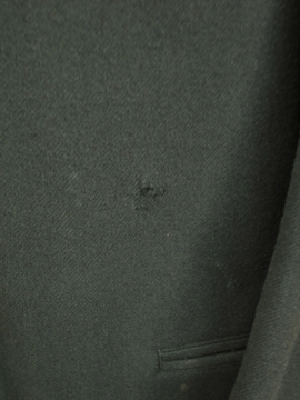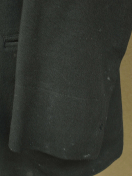 1930年代頃までにつくられたウール・ジャケット。カーブした袖や少し膨らみのあるチェスト部分、立体的なつくりが美しいです。上部は比較的身体にフィットし、裾に向かって広がるAラインの良いシルエット。ポケットは両玉縁で表に3個、内側右胸に1個。全体的にスレとスレによる穴(フロント左中央あたり)、左袖口に1.5cm程の直し、包みボタンに擦れ、そのほか全体的に小さな穴が数か所、多少の汚れなど経年の痛みがあります。年代や素材を考えると状態は良いと思いますが、ダメージを気にされない方にお勧めいたします。