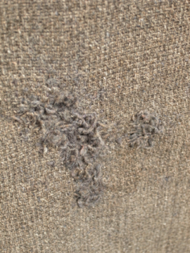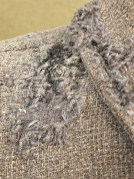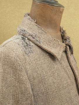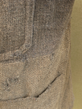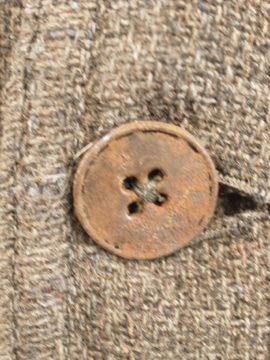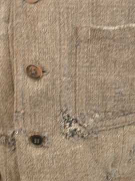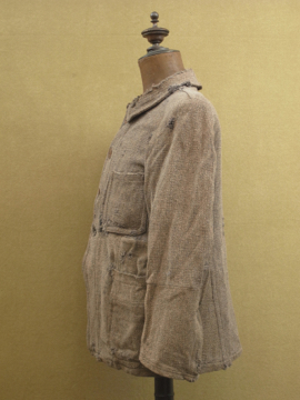 1930年から1940年代頃につくられたワーク・ジャケット。ウール素材の一枚布で、裏はチェック柄の布地です。フロントに3つのポケット、右胸内側にもポケットがあります。メタル製ボタンは錆ています(一つ付け替わっています)。全体的にスレや穴、直し痕が多くありますが、かなりの雰囲気があります。ダメージを気にされない方にお薦めいたします。