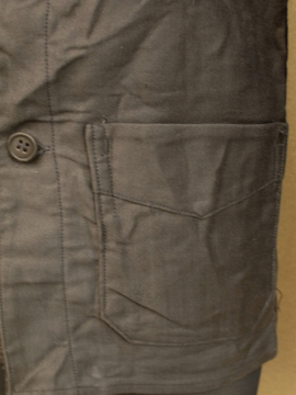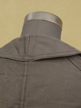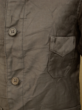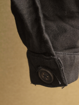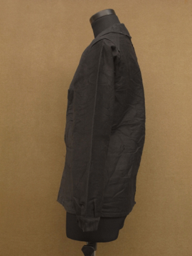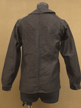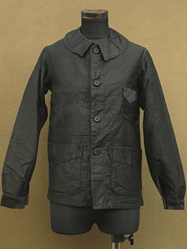 1930年から1940年代頃につくられたブラック・モールスキン・ワークジャケット。フランスのワークウエアらしい大きめの丸みのある襟が良いです。ボタンは木製です。おそらく未使用品のようで状態はとても良いです。このような古い良いもので小さいサイズは希少、小柄な女性にお勧めです。