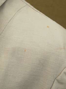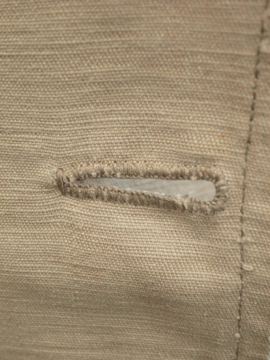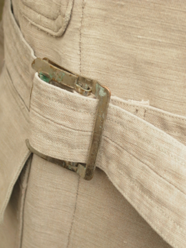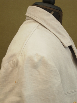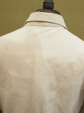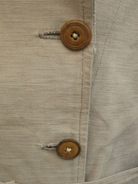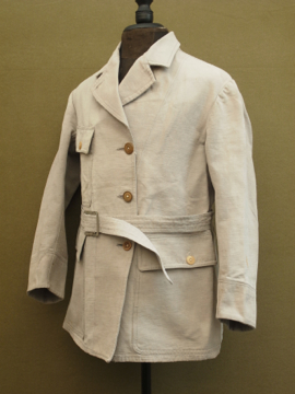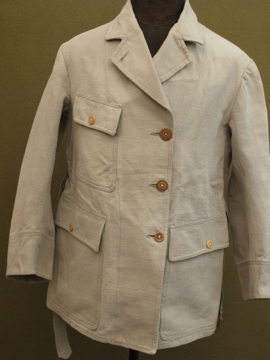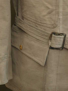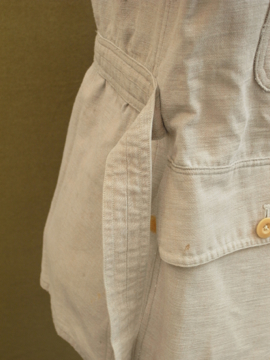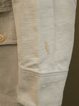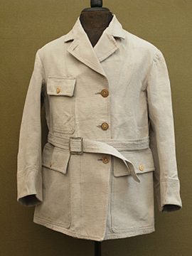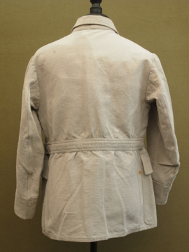 1940年代頃につくられたジャケット。ベージュに淡いグリーンが入った、何ともよい色目の布地です。素材はコットンに若干リネンが混ざったような質感です。男性用ですがフロントの合わせが逆につくられています。フロントについた3個のフラップポケットは大きくて使いやすいです。ボタンは樹脂、木、コロゾなど様々なものに付け替えられています。ベルトはバックに縫い付けられています。全体的に染み、糸のほつれ、小さな穴、擦れなど経年の傷みがあります。ダメージや古いものに理解のある方にお勧めです。