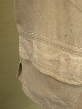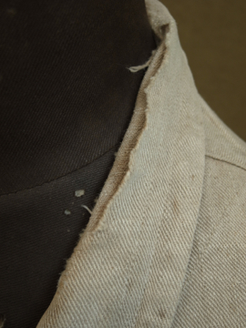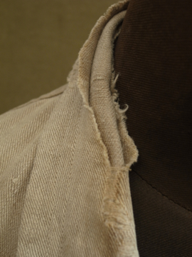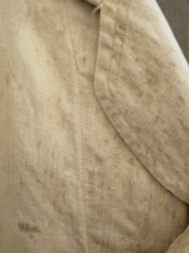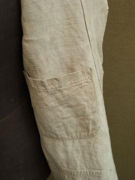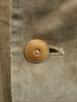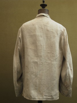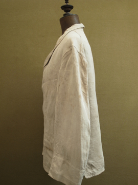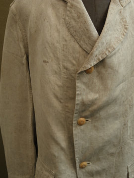 1930年代頃までにつくられた3つボタン・リネンジャケット。布の風合いが良く、シンプルなつくりですが綺麗なシルエットのとても良い品です。フロントに胸ポケットがなく、左右にフラップポケット、内ポケットが一つ。ボタンはコロゾナット、ボタンホールは手縫いです。襟の首裏部分が擦り切れ、全体的に小さな穴やシミがあります。使用感はありますが布に味わいが増しています。