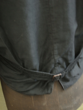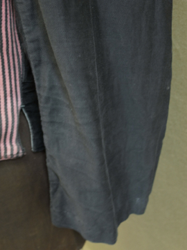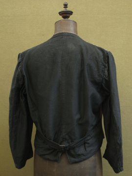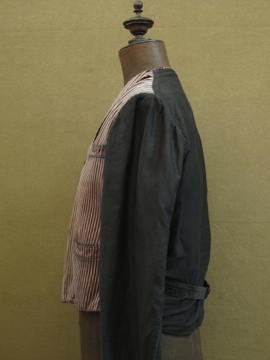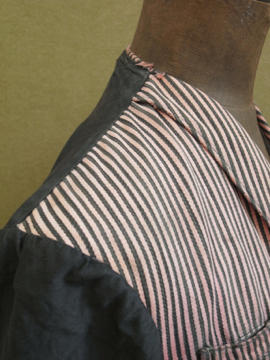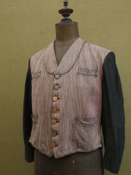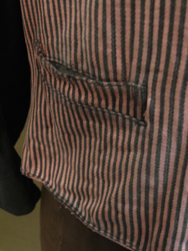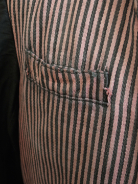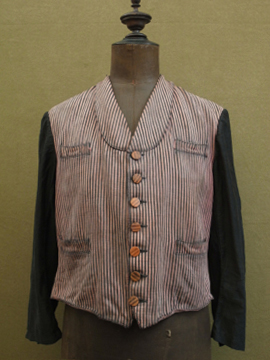 1930年代頃につくられたストライプ織りのワークジャケット。屋敷の使用人等が着たものです。素材はコットン、色褪せた赤に黒が滲み出たストライプの布地は味わいがあります。ポケットは表に4つ、内側に1つ。バックについたストラップで身幅の調節ができます。襟やポケット周り、裾等に擦れた裂けや小さな穴、ほつれがあります。