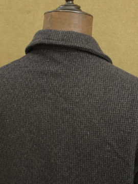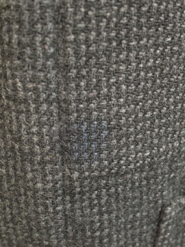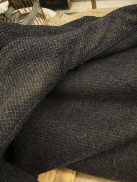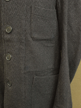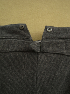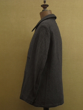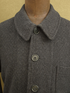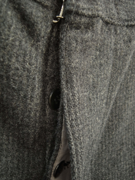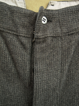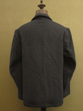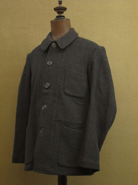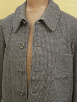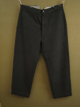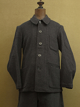 1930年から1940年代頃につくられたウールのジャケットとパンツのセットアップ。細かいグレーのチェック織りの布地でつくられています。ジャケットはフロントに3つのポケット、内ポケットが1つ。フランスのワークウエアらしく丸みがあり少し垂れた襟、立体的な袖のつくり等、良い雰囲気があります。 襟の内側に擦れた変色、ややシミが見られますが、全体的にとても状態が良いです。パンツはウエストラインのバックが少し上がり、裾に向かって少しテーパードした綺麗なシルエット。サスペンダー用ボタン、バックにストラップがついています。ポケットは両サイドの2つのみ。こちらも若干シミがありますがとても状態が良いです。上下ともにボタンはプラスチック製、ジャケットの一番下のボタン等、一部付け替わっています。このように上下揃って見つかることは稀です。