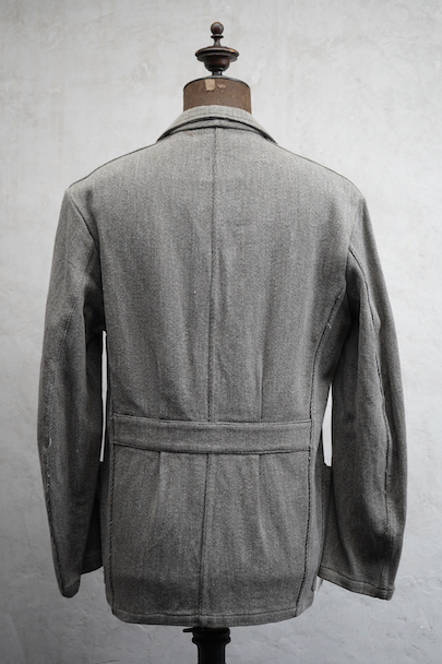 1940年代頃につくられたワークジャケット。デッドストックを一度洗濯しています。ブラウン・ベージュ系のごま塩コットンの細畝ピケです、少し裏起毛しています。フロントは3つボタン、バックにマルタンガル。立体的な袖。内ポケットが1つついています。表記サイズは42。特にダメージはなく、状態は良いです。飽きが来ないプレーンな良いジャケットです。
