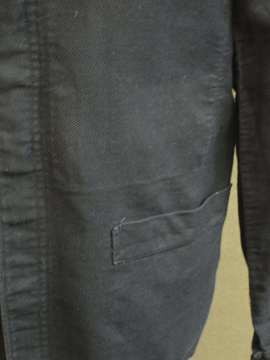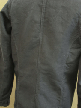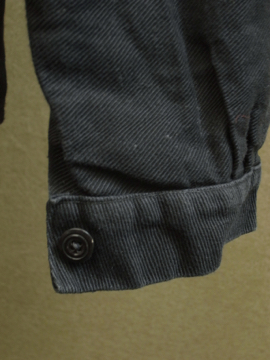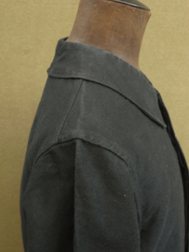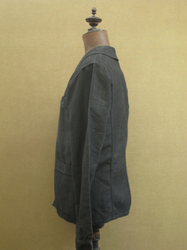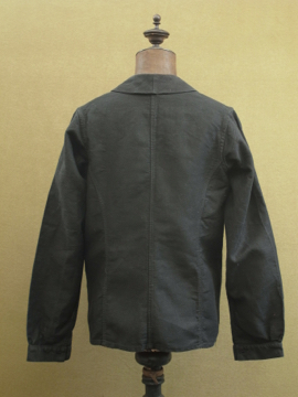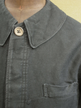 1930年代頃につくられたワークジャケット。少しコットン混かもしれませんが、とても珍しい黒いリネンのツイル素材です。比翼仕立てのフロント、ボタンは木製です(袖口のボタンは別素材)。ワークジャケットに多いパッチポケットではなくカットインされたポケット、バックのパターンも綺麗です。フレンチワークらしくカーブした襟は縫い留められています。目立ったダメージは無く状態は良いです。