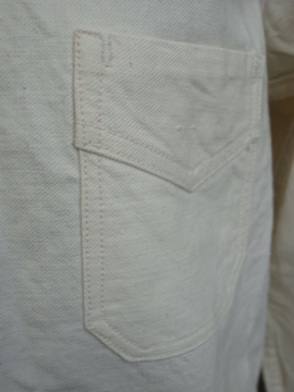 1930年代から1940年代頃につくられたワークジャケット。少し張りのあるコットンツイル地は生成りでナチュラルな良い風合いです(全体的にみられる黒い点は夾雑物でダメージではありません)。大きく丸みのある襟がフランスのワークウエアらしく、パピエマシェのボタンも年代を感じます。元々男の子用につくられたものでしょうか、小さめで大人女性のXSからSサイズくらいです。あまり使用されていなかったようで、目立ったダメージは無く状態は良いです。