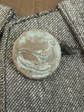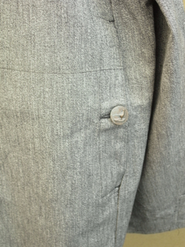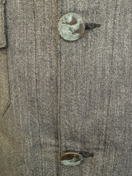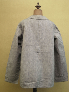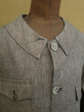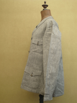 1940年代頃までにつくられたハンティング・ジャケット。ごま塩のコットン素材、この素材のハンティングジャケットは希少です。デッドストックを1回洗濯しています。バックについたハンティングジャケット特有の獲物を入れるための大きなゲームポケット、内側が2本ストラップで吊られた珍しい形です。フロントに4つのボタン留めフラップ付きポケット、内ポケットが一つ。縫い留められたぺたんとしたフレンチらしいカーブした襟、袖口にタブ、ディテールも良いです。ボタンは動物柄メタルボタン、青サビがあります。その他は目立ったダメージはなく、状態はとても良いです。