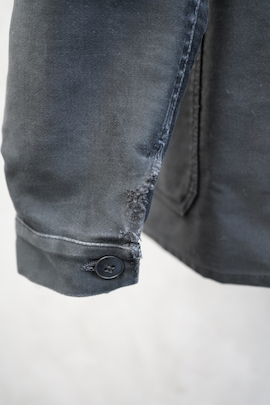 1940年代から1950年代頃のブラックモールスキンワークジャケット。中厚手のコットン素材です。丸くカーブした襟がフレンチワークらしいです。袖口付近に擦れや直し痕、バック中央あたりに2cmの傷(穴は空いていません)、全体的に若干の汚れや色褪せ、擦れがありますが、大きなダメージはなく状態は良好です。