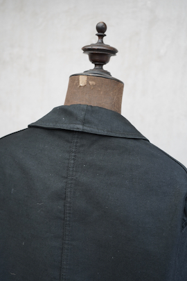 1930年から1940年代頃のブラックモールスキンワークジャケット。中厚手のコットン素材です。フレンチワークらしい丸くカーブした襟、Vステッチ入りポケット、胸のポケットは低めについています。艶感のある黒が美しい古い風合いのモールスキン素材、ボタンは木製。若干の汚れや擦れがありますが、使用感は少なく状態は良いです。