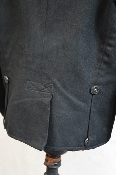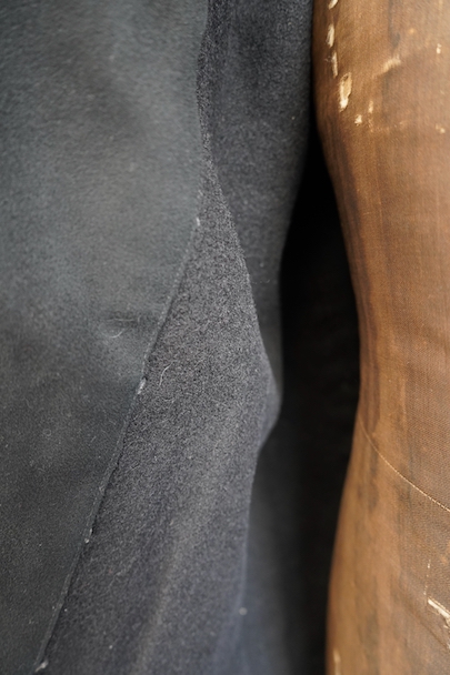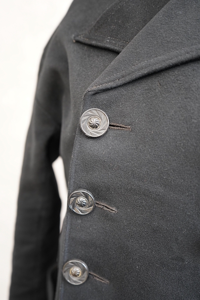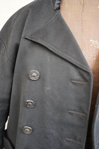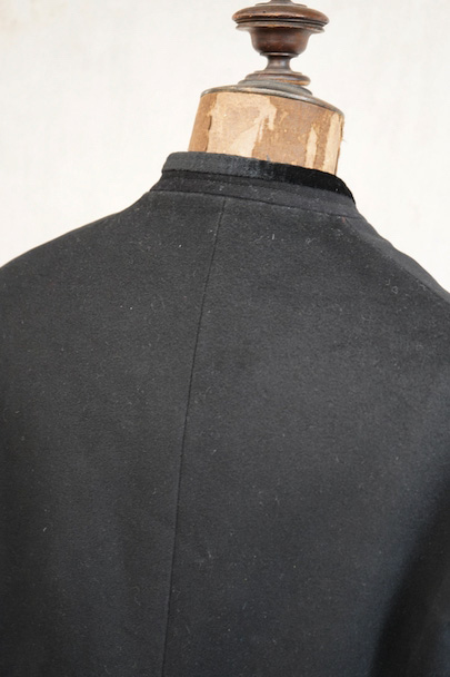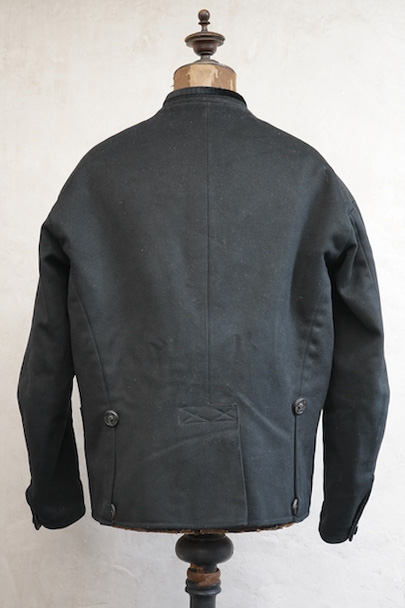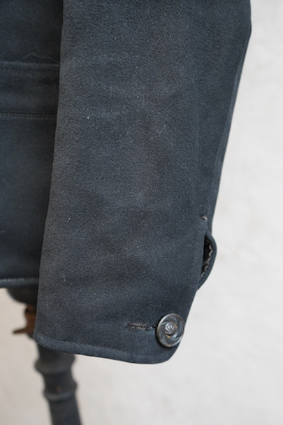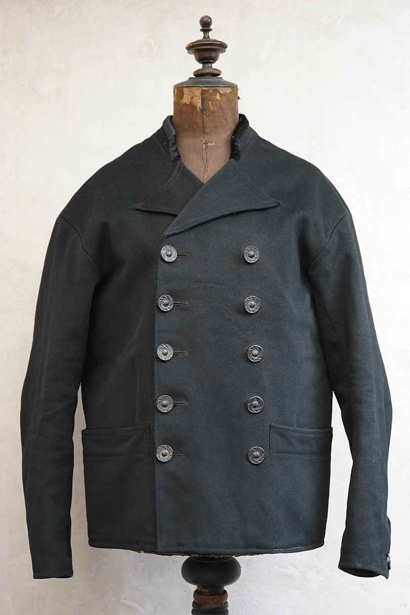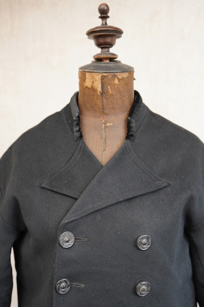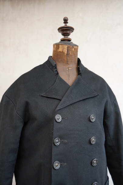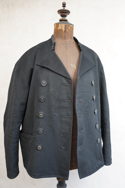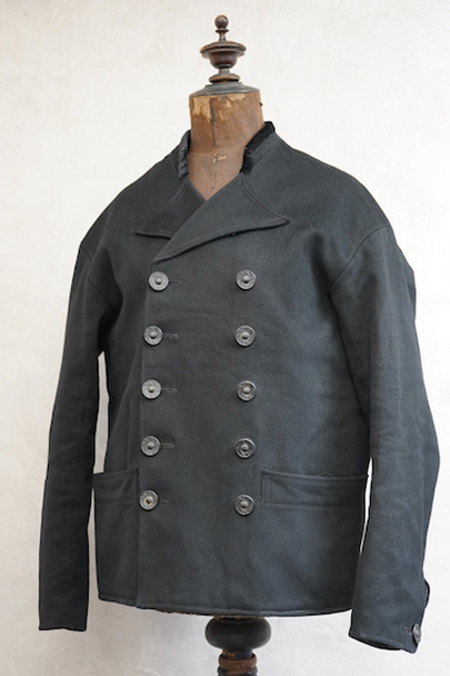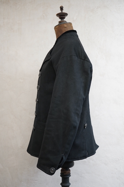 オランダのウールのダブルブレスト・ジャケット。20世紀初期頃のものだと思います。立ち襟にワイドなラペル、クラシカルな形が趣のあるジャケットです。襟部分に光沢のある毛足のパイピングがされて良いアクセントになっています。身頃はウールの裏地が張られています。袖部分の裏地にはかなり味わいのあるリネンが使われています。ポケットが左右について使いやすと思います。装飾の入ったボタンは全て揃っています。ボタンホールは手縫い。バックの意匠も面白いです。小さい傷や袖口の裏地に擦れた穴、多少の擦れや汚れなどはありますが、年代と素材を考えると全体的な状態はとても良いです。