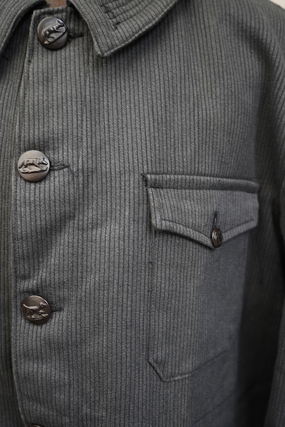 1940年代から1950年代頃につくられたハンティング・ジャケット。グレーのコットン・ピケ素材。デッドストックを一度洗濯しています。"Unic D.F" 刺繍タグ。ステッチの入った襟、フロントに4つのボタン留めフラップ・ポケット、バックにハンティング特有の大きなゲームポケット。ボタンは動物柄のメタルボタン。特に保管中のダメージはなく状態は良いです。表記サイズは54、大きめサイズです。
