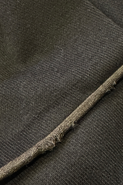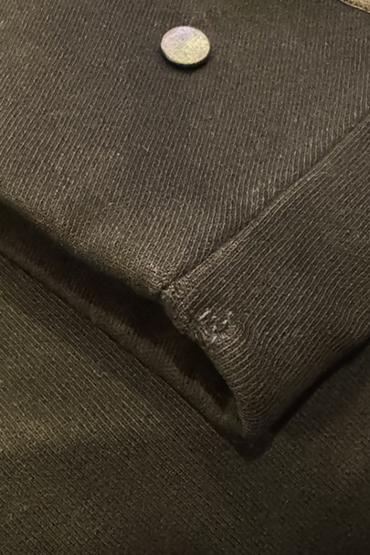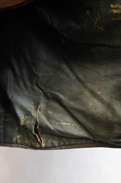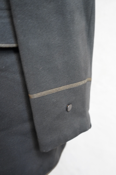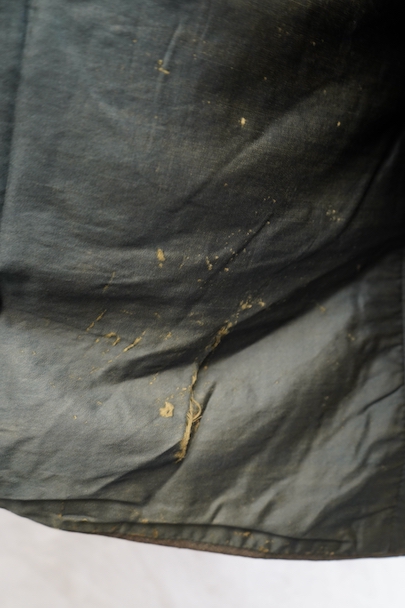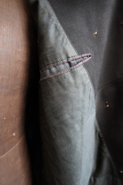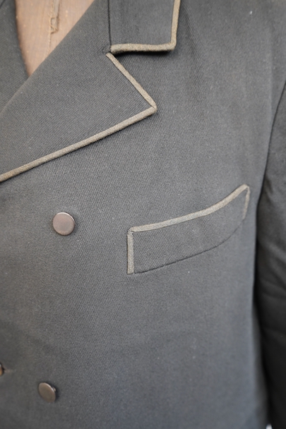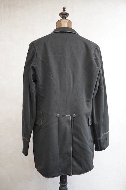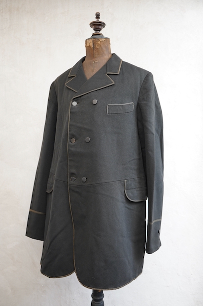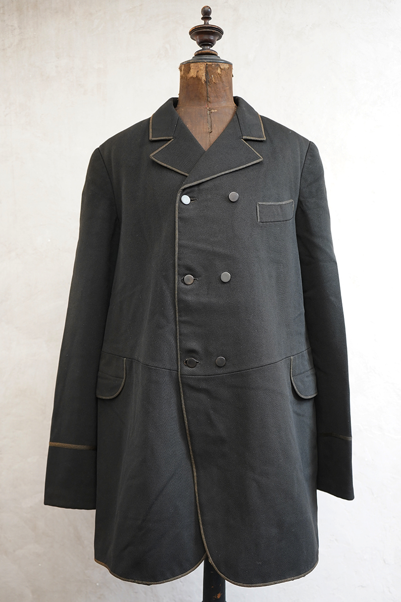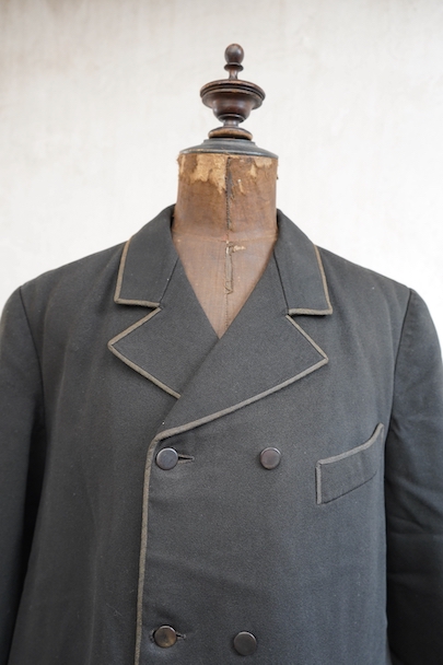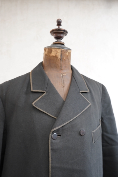 20世紀初期頃にオランダでつくられたダブルブレストのウール・ジャケット。ハーフコートくらいの丈できれいな形です。立体的な作りなので実際の身幅の着用感は採寸の約53cmより前身頃にゆとりがあります。襟から前立て、ポケットの口などがパイピングされたデザイン。襟裏には細かいステッチが入れられています。左右に大きめのフラップがついたポケット。襟後方や裾のパイピングに擦り切れ、袖口に小さい直し痕はありますが、表地の状態は良いです。裏地には擦れた傷み、特に裾近くに裂けがみられます。