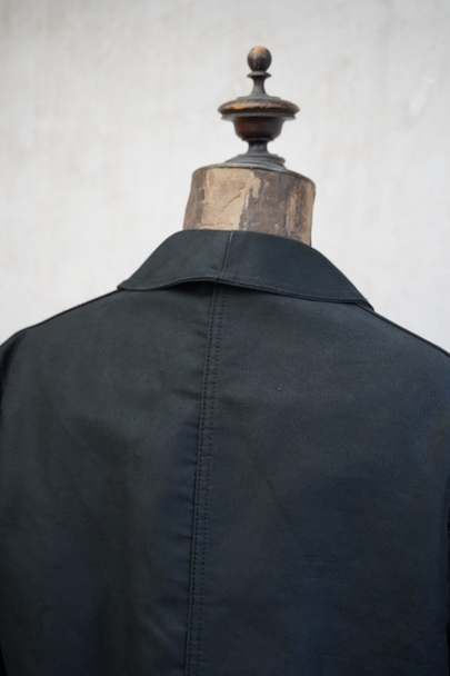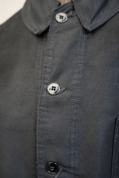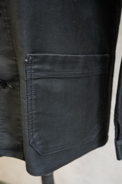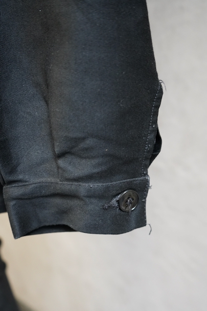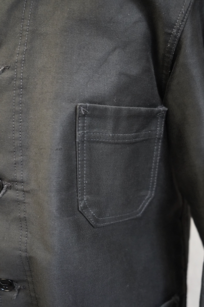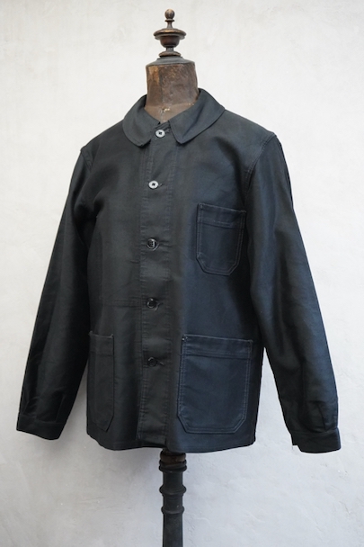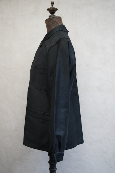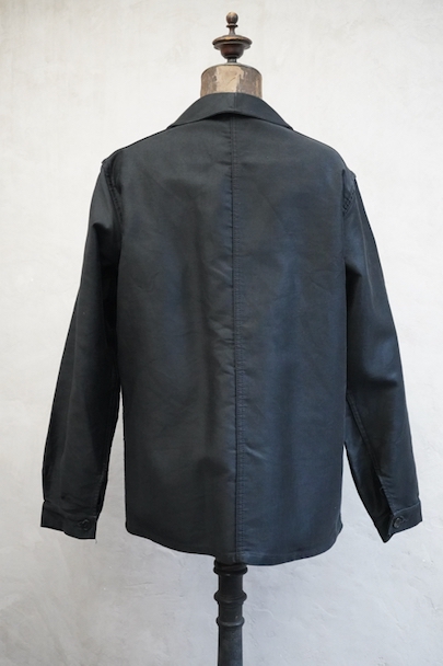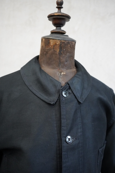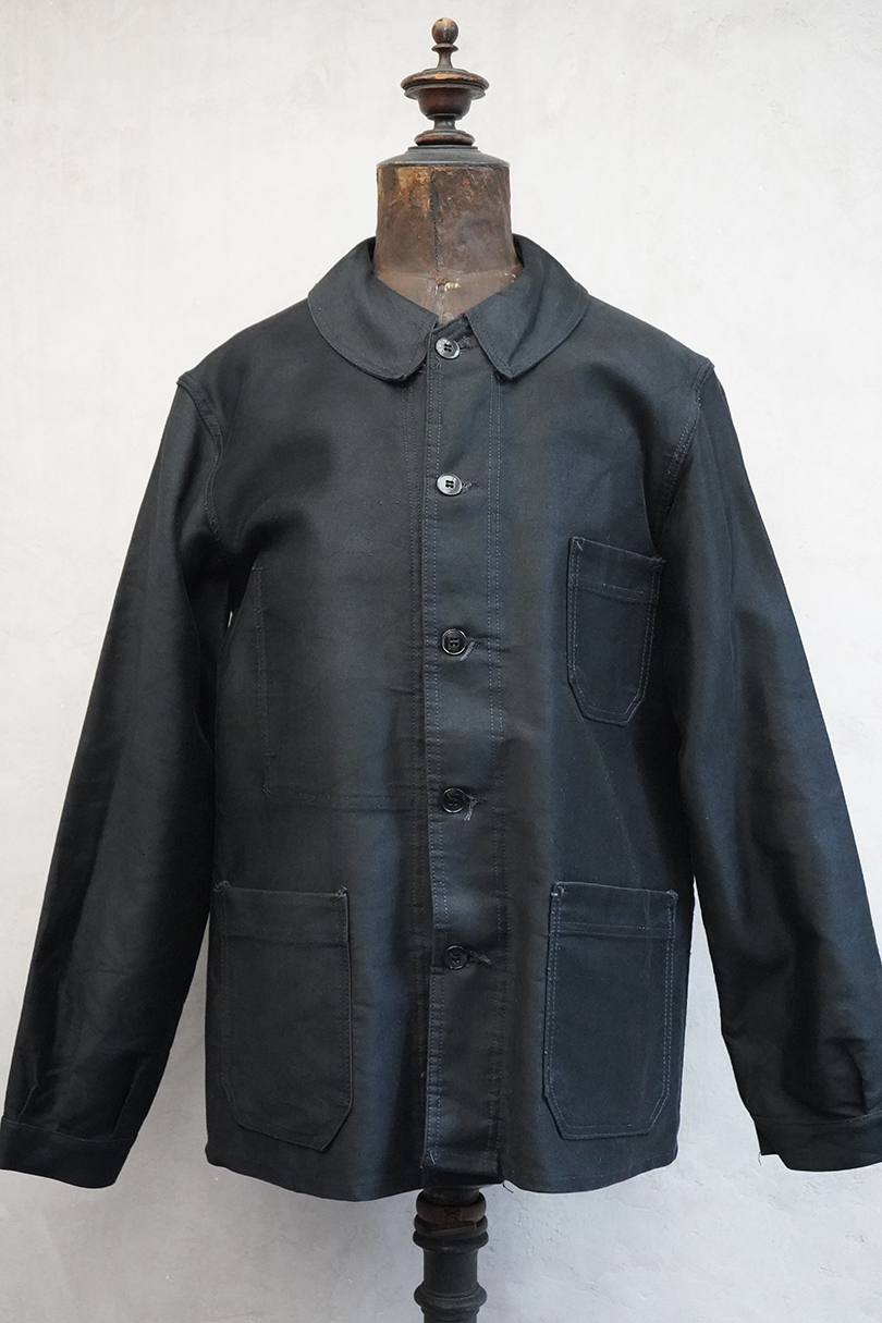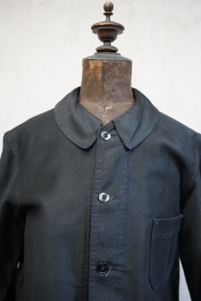 20世紀中期頃につくられたブラック・モールスキン・ワークジャケット。光沢のある中厚手のコットン素材です。フレンチワークらしい丸くカーブした襟、襟は身頃に縫い留められています。ボタンはプラスチック製。前立てや袖の裏側などに擦れた傷み、左右の袖口周辺に擦れたダメージ、左袖口近くに手縫いの直し痕、全体的に擦れやほつれなど、経年のダメージがあります。使用感が少なく状態は良いです。