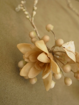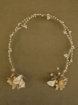 1920年代頃につくられたウエディング用のヘッドドレス。ワックスでくつられたつぼみと花、パールのような光沢のガラスビーズで装飾された繊細で美しい品です。ワイヤーが入っているので多少曲げることができます。全体的に欠けや割れ等の経年の傷みがありますが味わい深いです。
