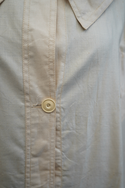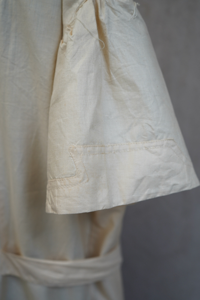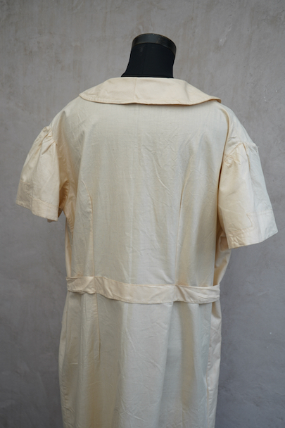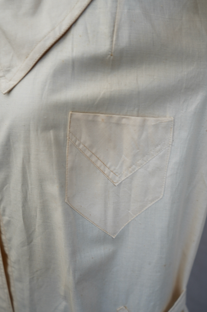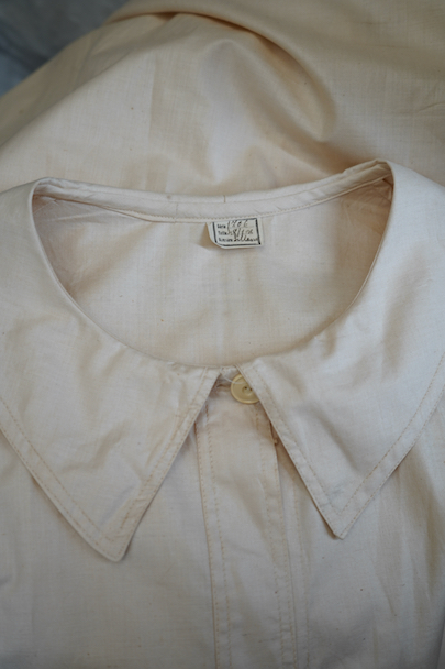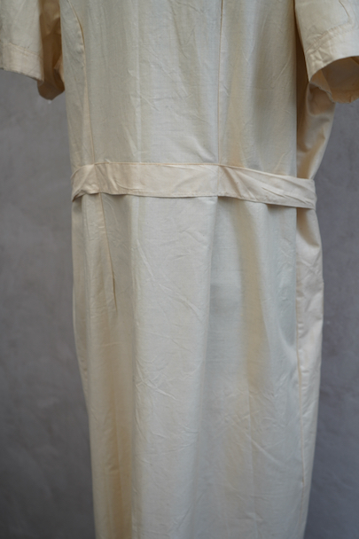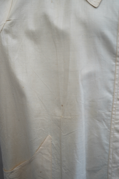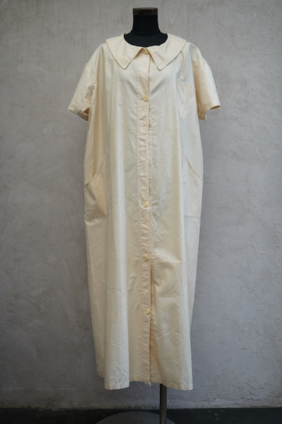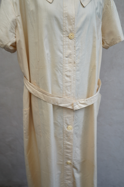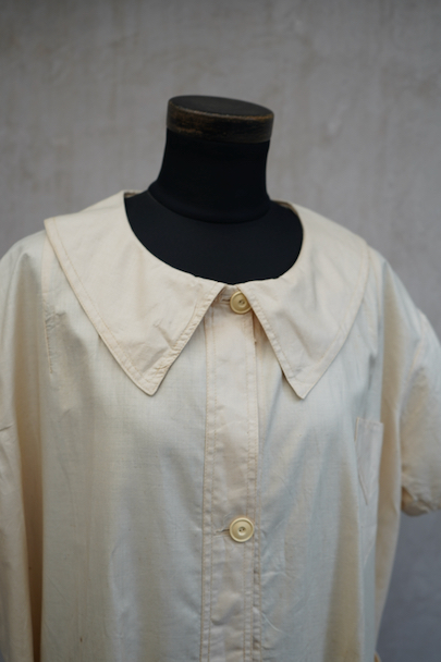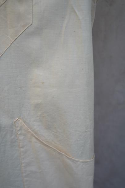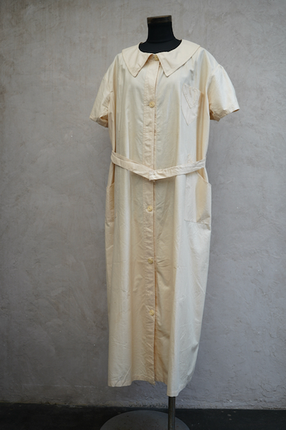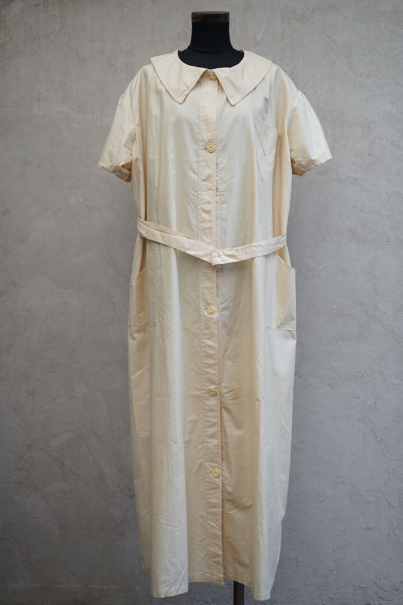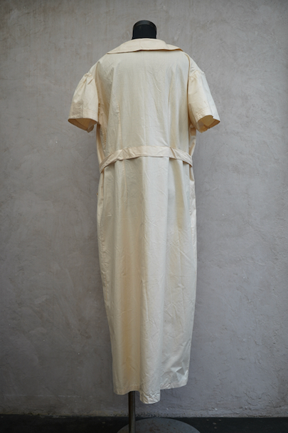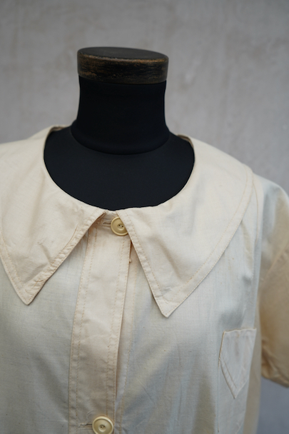 1930年代から1940年代頃につくられたワークドレス。薄手のコットンの素材です。紙タグ付きの未使用品で、一度洗濯しています。汚れよけの為に着用されたもので、オーバーサイズの緩めのシルエットが可愛い品です。生地が薄いので、オーバーサイズでも綺麗に着こなしやすいと思います。ウエストベルトはバックに縫い付けられています。大きな丸みのある襟が印象的で、袖のステッチやポケットのつくりなど、細部にもこだわりを感じます。保管中にできた汚れ、縫製に若干の粗さを感じますが、独特の雰囲気を持った良い品です。