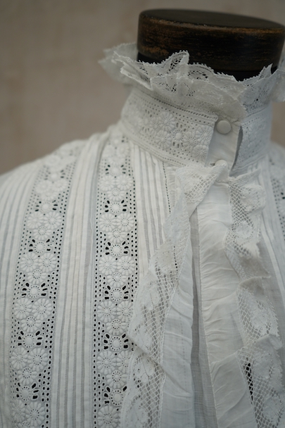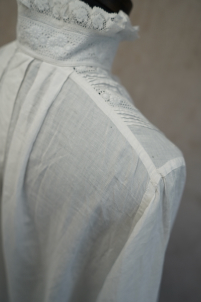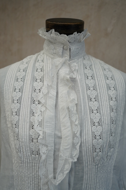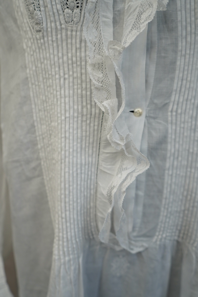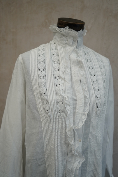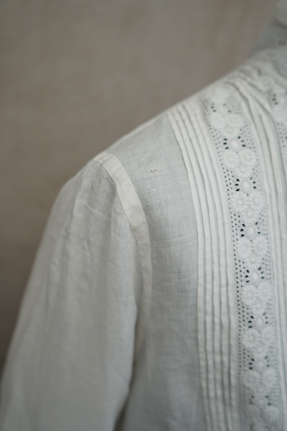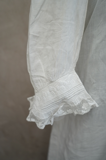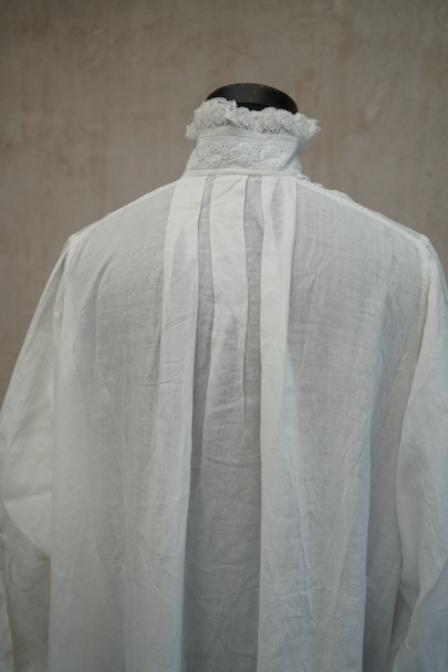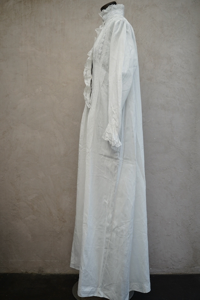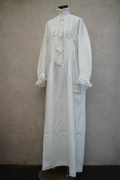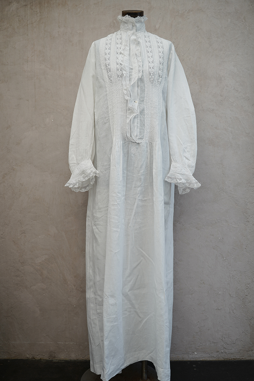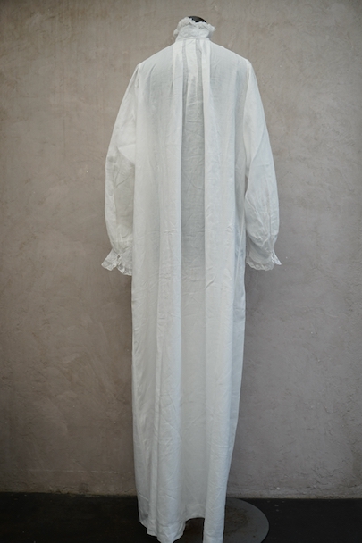 20世紀初期頃までにつくられたロングドレス。薄手で目の詰まった滑らかなリネン生地に、細かいタックやフリルなど手作業の素晴らしさに感動する品です。フロントにはイニシャル刺繍の上に王冠刺繍が施されているので、王侯貴族が使用したものだとわかります。ボタンは包みボタンやシェルボタンなど、部分的に付け替えられています。右肩近くとフロント下のボタン横に小さい手縫いの直し痕、バックに1.8cm程の染み、その他小さな染みや穴が数か所あります。使用に問題ない程度ですが、ダメージを気にされない方にお勧めです。年代を考えると状態は良いと思います。