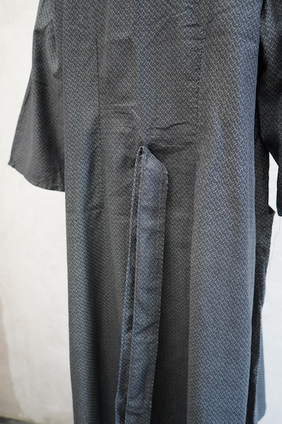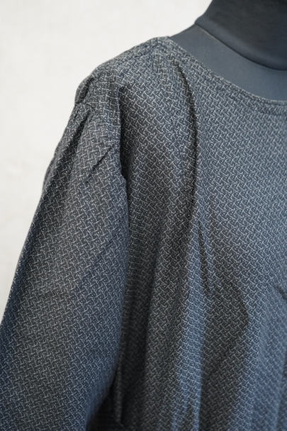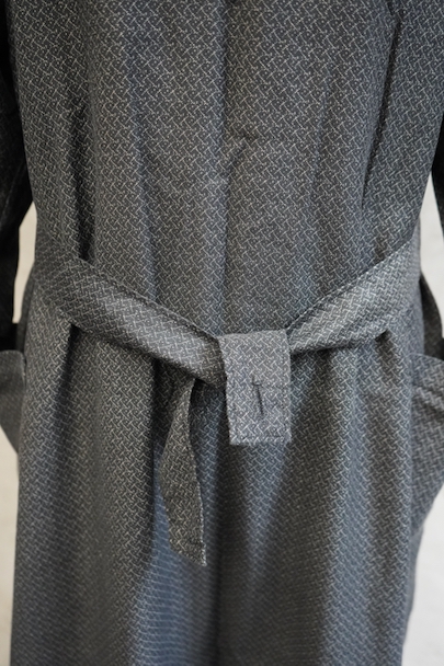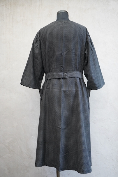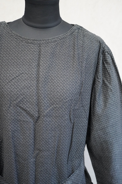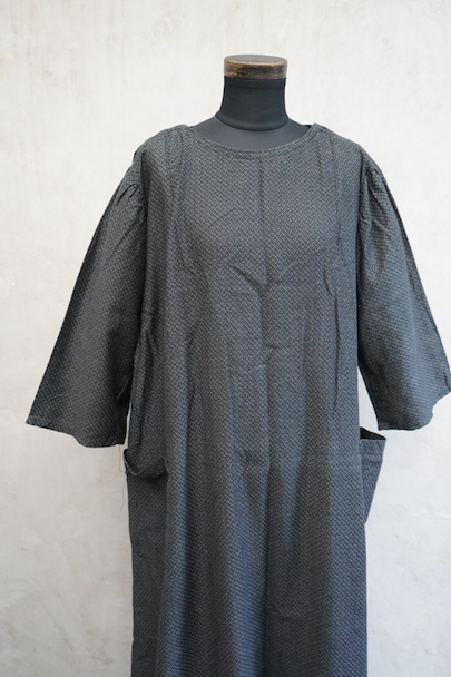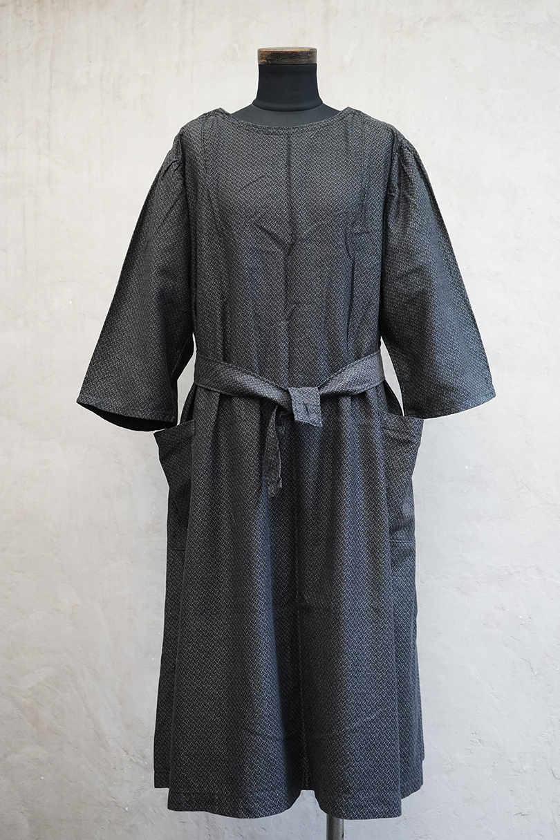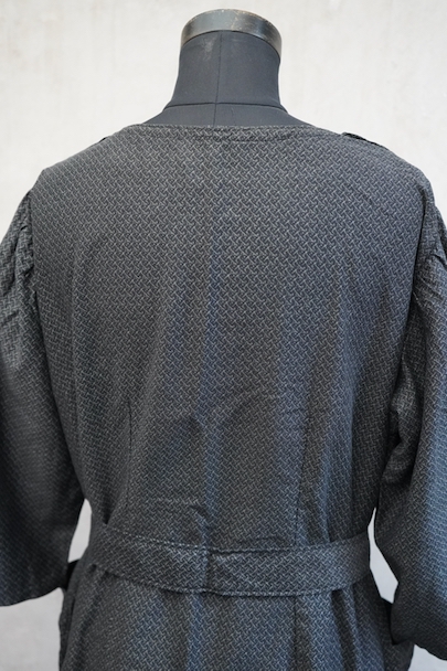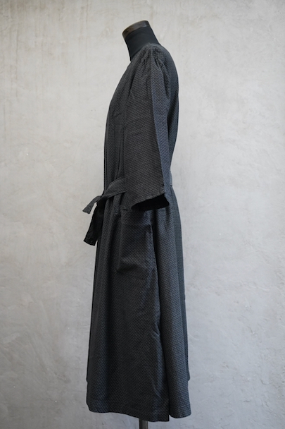 1930年代頃につくられた5分袖のワークドレス。黒地に白ドットのプリントが入ったコットン素材です。ネックラインの左右にスナップボタンがついて開閉できるようになっています。ウエストベルトがバックに縫い留められています。使わない時はポケットに入れておくと邪魔になりにくいです。状態は良いです。
