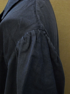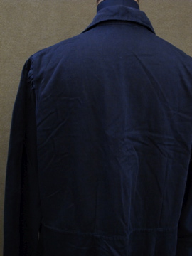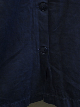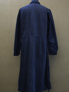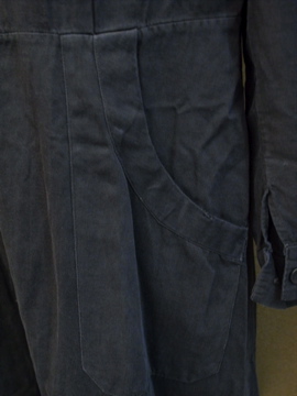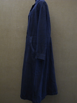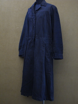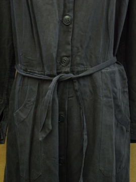 1940年代頃につくられたワークドレス/コート。コットン素材です。単色でシンプルですが、肩にギャザーが入り、少し膨らみのでるスタイルで可愛らしさも感じます。左右の脇に直し痕、全体的に色あせ、小さな汚れやスレなど、経年の傷みがあります。ウエスト右にベルトが縫い付けられています。使用しない時はポケットに入れてしまっておくと良いでしょう。