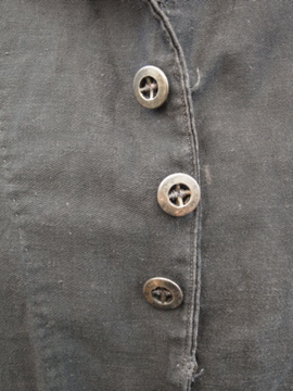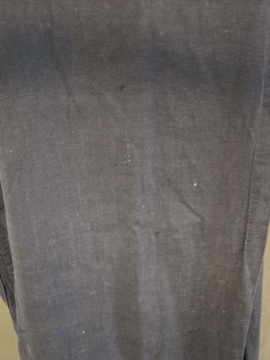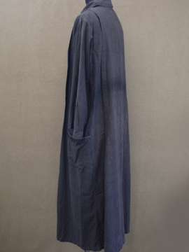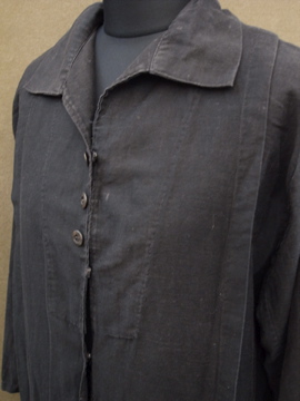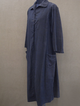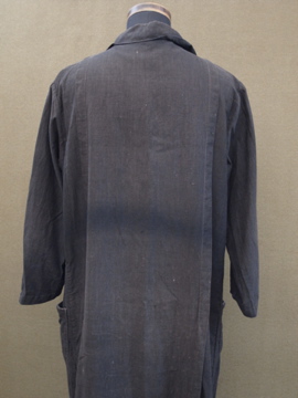 1930年から1940年代頃につくられた黒いワークドレス。コットン素材です。小さなポケットのついたシンプルな作業着ですが、とてもシルエットが良く雰囲気のある品物です。昔、フランスの工場で女性が着用してものです。かぶりで着用しフロントの上部をスナップボタンで留める仕様で、表についたメタルボタンは飾りです。使い込まれて出た布地の色ムラやスレなどのダメージが良い風合いです。ベルトの跡でしょうか、バックに大きく帯状に色が濃い部分があります。着用に問題ないですが穴や直しなど全体的に経年の傷みがありますので、ダメージを気になさる方にはお勧めいたしません。