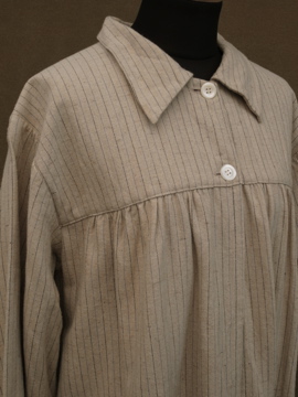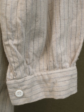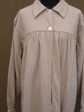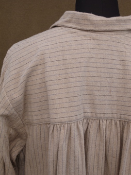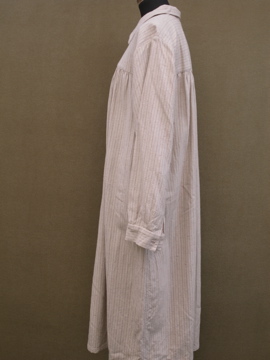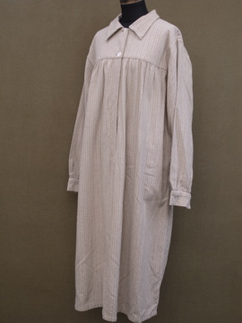 ロング丈のウール・スモック/ドレス。おそらく1920年から1940年代頃につくられたものだと思います。ベージュ地にブルーと黒の細いストライプと茶色いネップが入った良い風合いのウール素材です。上部の切り替えにはギャザーが入り、布地をたっぷりと使用した動きやすいつくりとなっています。フロントボタン下に35cm程の開きがあります。ボタンは程よい光沢の貝製で、自然と擦り減ったフォルムが良いです。毛玉など多少の使用感はありますが、大きなダメージはなく状態は良いです。