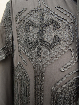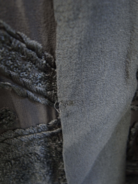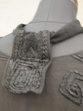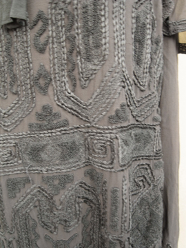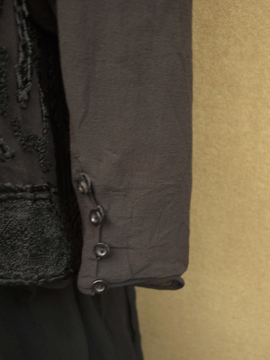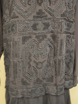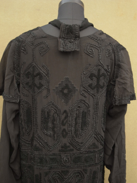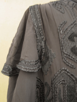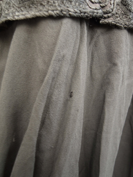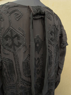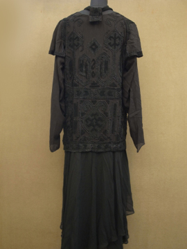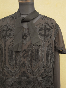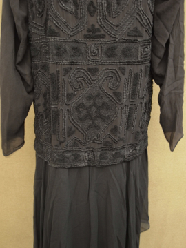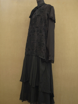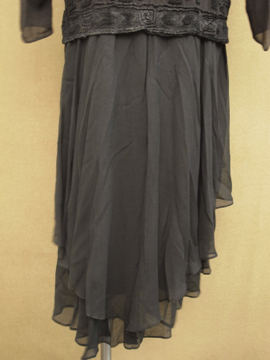 1920年代後期頃につくられたブラック・ドレス。シルクシフォン生地に細かく刺繍が施された存在感のある品です。刺繍は紐と糸の使い方が面白く、ボリューム感や柄等とても凝ったつくりです。スカート部分は3段になっていて、長さのバランスが美しいです。スカート部分は直しが施されたようで、部分的にセルロース系のシフォン素材が使われています。素材が変わっていることは見た目にはほとんどわからない程度です。スカート部分に0.7cmの穴、そのほか裏地に大きな破れや穴、表地にも小さな穴や裂け、擦れなど経年の痛みがあります。年代や素材を考えると状態は良いですが、古いものに理解のある方にお勧めいたします。