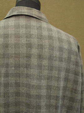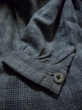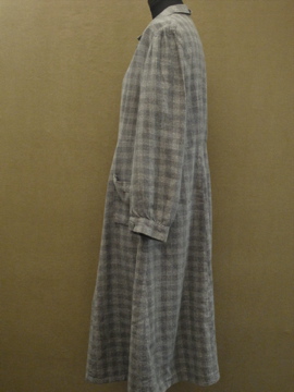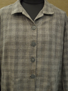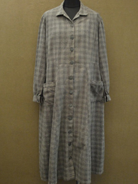 1930年から1940年代頃につくられた女性用ワークコート。薄手のチェック織りコットン素材、使い込まれた柔らかい質感が魅力です。フロントが開くので羽織りものとしても使えます。ボタンが多めでおもしろいつくりです。ウエスト上に切り替えがあり、裾に向かって少し広がるシルエットが良いです。脇に2cmと右ポケット上に3cmの直し痕、フロント前立てにスレがあります。ポケット部分の布地が伸びて少し膨らみが出ている等、時代を感じさせ趣があります。