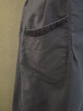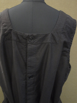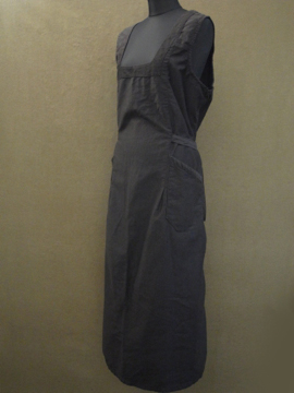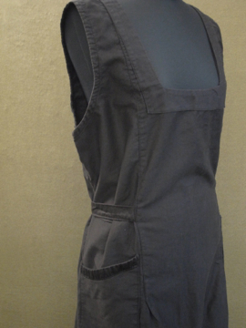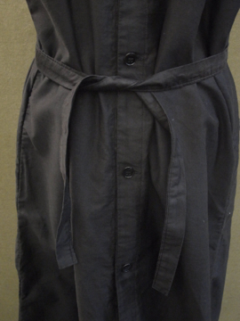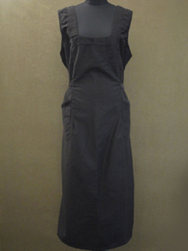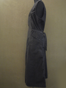 1940年代頃につくられたノースリーブのワーク・ドレス/エプロン。薄手のモールスキンのような少し光沢のあるなめらかなコットン素材です。フロントに縫い付けられたウエストベルトをバックで結ぶのですが、ベルト位置が高めでシルエットが綺麗です。スクエアのネックライン、口が斜めになったポケット等、シンプルな中にもデザインの良さが感じられます。バックをボタンで留める仕様で、一番下のボタンから裾まで33cmの開きがあります。状態は良いです。