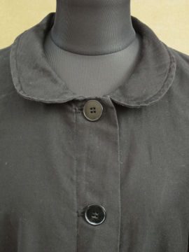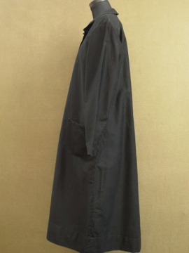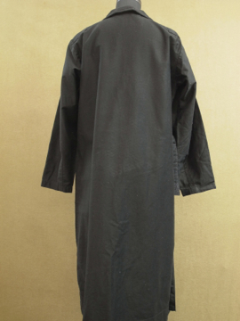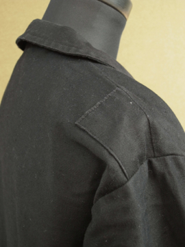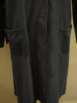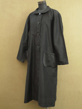 1930年から1940年代頃につくられたブラック・ワークドレス。程よく光沢のある質の良いコットン素材です。フロントは首もとからウエストラインまでボタン留め、ボタンはプラスチック製、ボタンホールは手縫い。丸い襟が可愛らしいです。ベルトはウエスト右に縫い付けられています。状態は良いです。