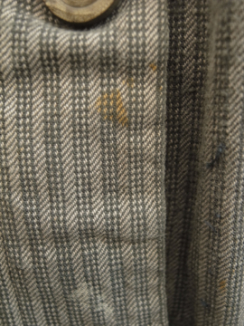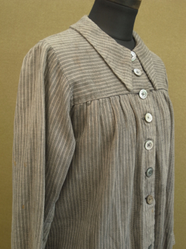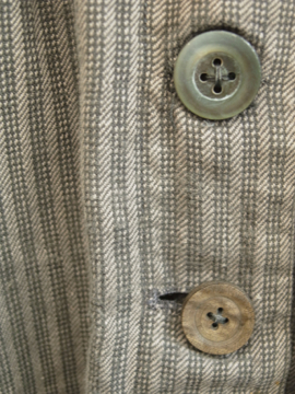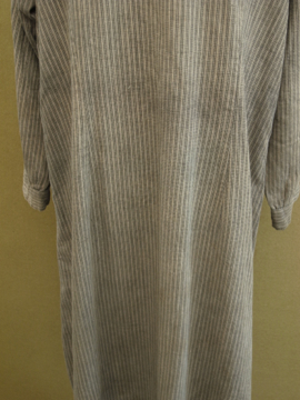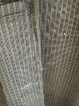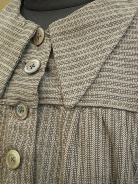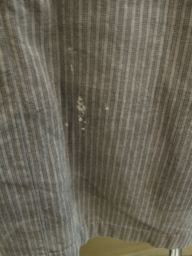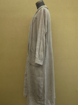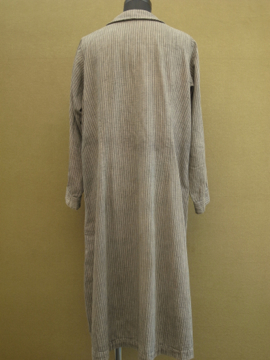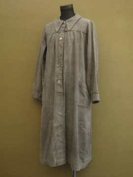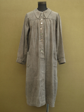 1930年代頃につくられたワーク・ドレス。ストライプ織りの良い風合いのコットン素材が使用された、女性用にしては珍しい品。大きく先の尖った襟、大きなシェルボタン、手縫いの素朴なボタンホールも良いです。全体的に染み、色抜け、手縫いの直し痕、小さな穴、擦れなど経年の傷みがります。サイズはSからMくらいです。とても良い雰囲気がある品なので、ダメージを気にされない方にお勧めです。