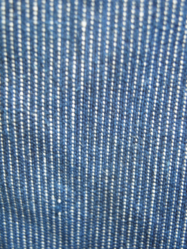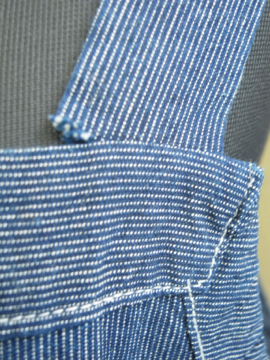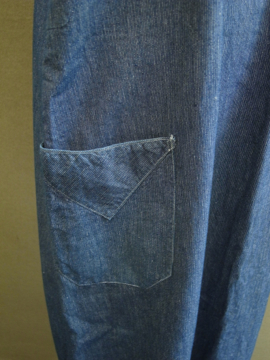 1930年代頃につくられたエプロン・ドレス。ストライプ織り柄のインディゴ染めコットン素材、おそらく未使用品だと思います。フロント左右にポケットがつき、バックをボタンで留める仕様。ボタンはシェル製、ボタンホールは手縫いです。左肩のストラップのフロント部分がずれて少し外れて縫われています。その他はとても状態が良いです。