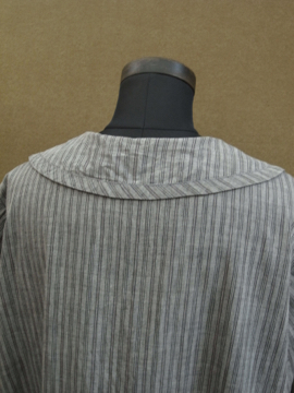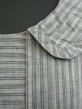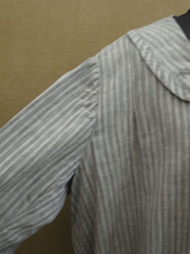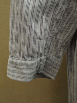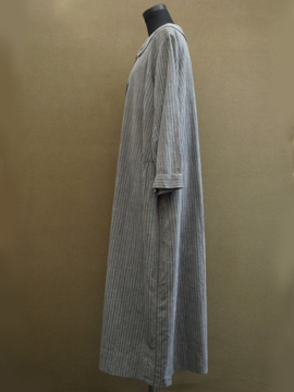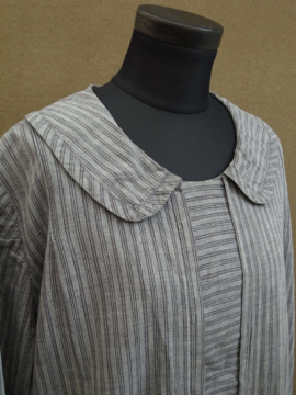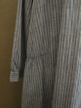 1920年代後期頃につくられたストライプ織り柄コットンのドレス。若干ハリのある良い素材です。フロントは股下あたりまで開きスナップボタンで留める仕様です。身幅は広めでローウエストのゆるいシルエット。大きく丸みのある襟、前立て部分は布の向きを変えて使ったデザイン、ウエストライン下の左右にギャザーが入っています。袖口周りに擦れや小さな穴、黒ずみが見られます。右脇に小さな手縫いの直し痕があります。サイズはLサイズくらいですが、細身の方がオーバーサイズで着用しても素敵です。