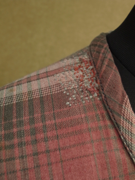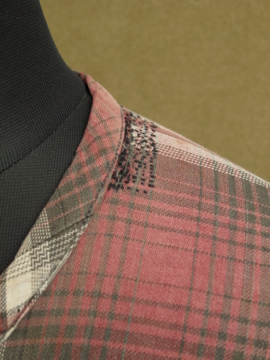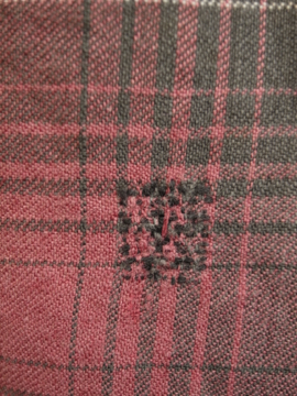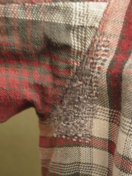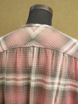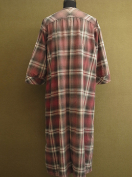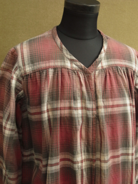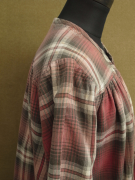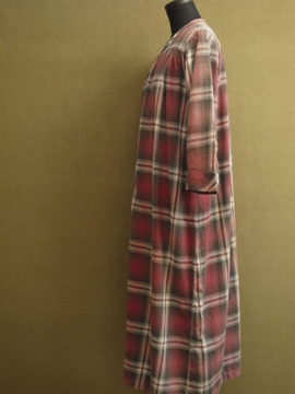 1930年代頃につくられたワークドレス。くすんだ赤いチェック柄のコットン素材。七部袖、上部切り替え下にギャザーが入り、裾に向かってAラインに広がるシルエット。フロント上部がスナップボタン留めで開きます。首回りや脇周辺に丁寧な直し痕が多くあり、それも良い風合いです。 全体的に小さな穴やシミがあります。ダメージを気にされない方にお勧めします。